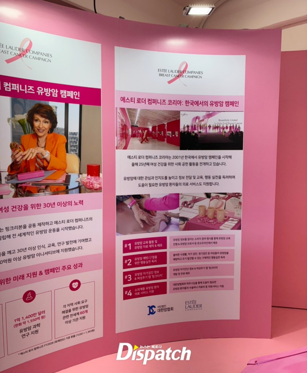 '디스패치'도 현장을 방문했다. 에스티로더는 대한암협회와 함께 암 자가 검진 방법 등을 상세히 공유했다. 암 관련 퀴즈 등 프로그램에 참여하면, 핑크 리본 뱃지와 선물을 나눠줬다.