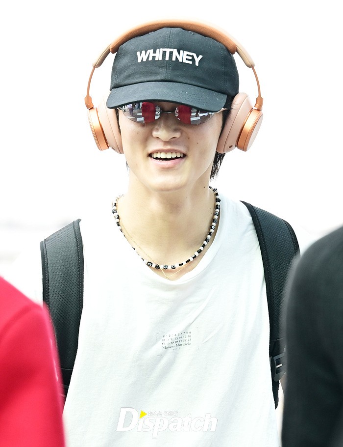 마크는 심플한 화이트 티셔츠와 모자, 헤드폰으로 힙한 스타일링을 완성했다. 해맑은 웃음으로 출국장을 나서는 모습이였다.
