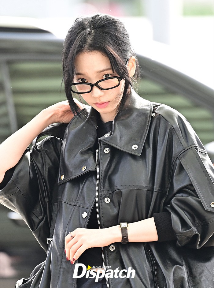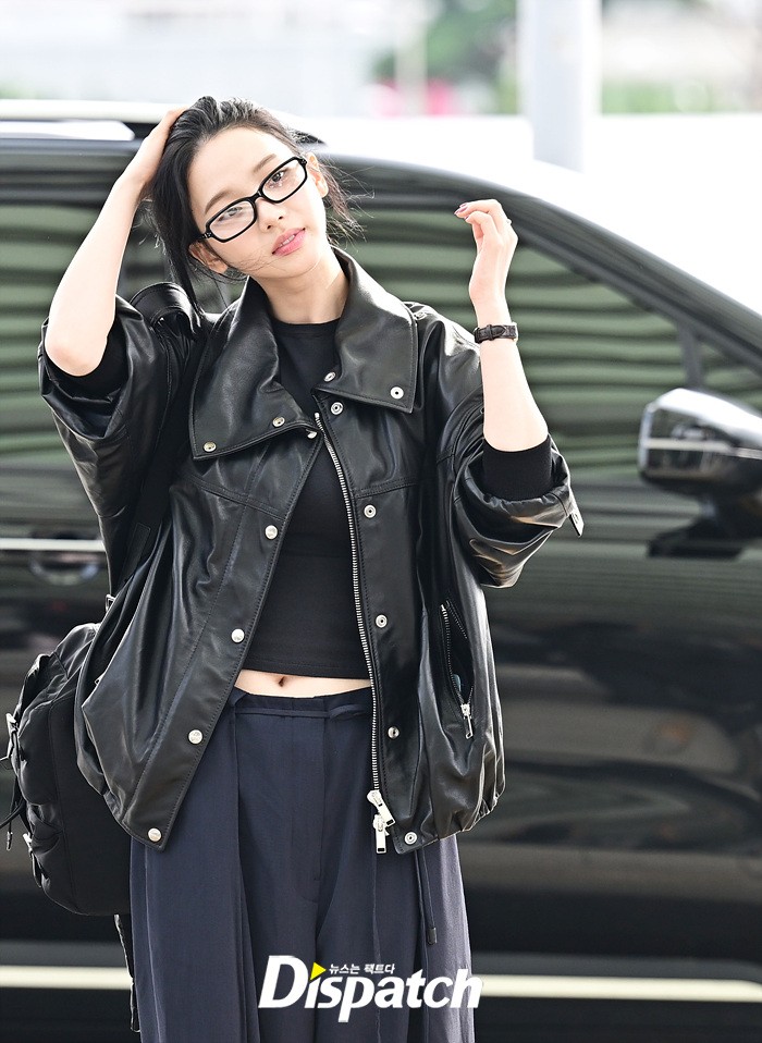 카리나는 가죽 재킷과 와이드 팬츠로 내추럴한 공항패션을 연출했다. 화장기 없는 얼굴에도 청초한 매력이 돋보였다.