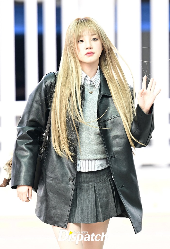 우기는 가죽 재킷과 미니 스커트로 시크한 공항패션을 연출했다. 인형같은 비주얼과 러블리한 미소도 돋보였다.