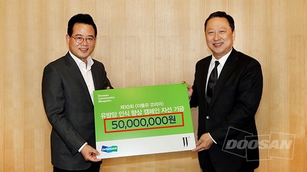 "박용만 두산그룹 회장 등이 참석한 가운데 W코리아의 유방암 인식 향상 캠페인 수익금 5,000만 원을 전달했다."