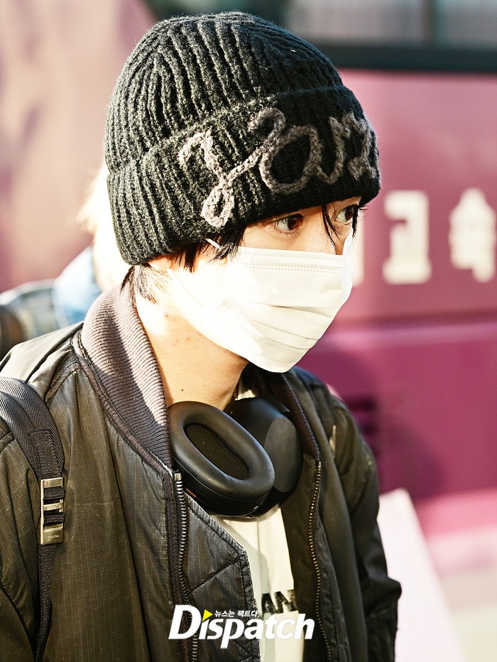 료는 블랙 점퍼와 데님진, 비니로 힙한 공항패션을 완성했다. 마스크에도 또렷한 비주얼이 돋보였다.