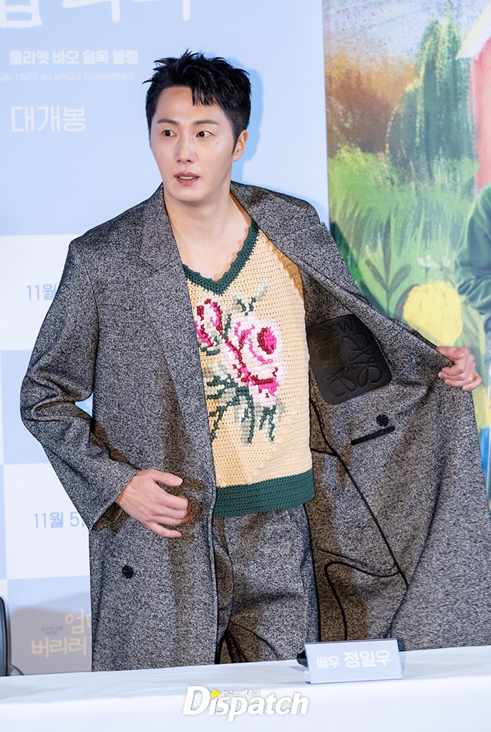 배우 정일우는 그레이컬러 롱코트에 화려한 니트로 멋진 맵시를 뽐냈다. 훈남 비주얼로 여심을 사로잡았다.