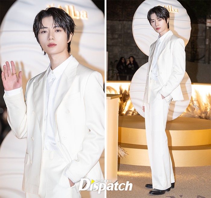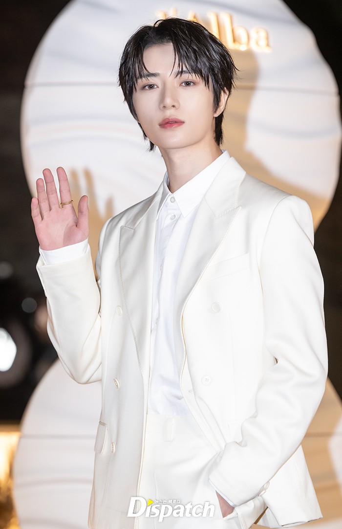 범규는 화이트 수트로 멋진 맵시를 뽐냈다. 만화 주인공 같은 비주얼로 여심을 사로잡았다.