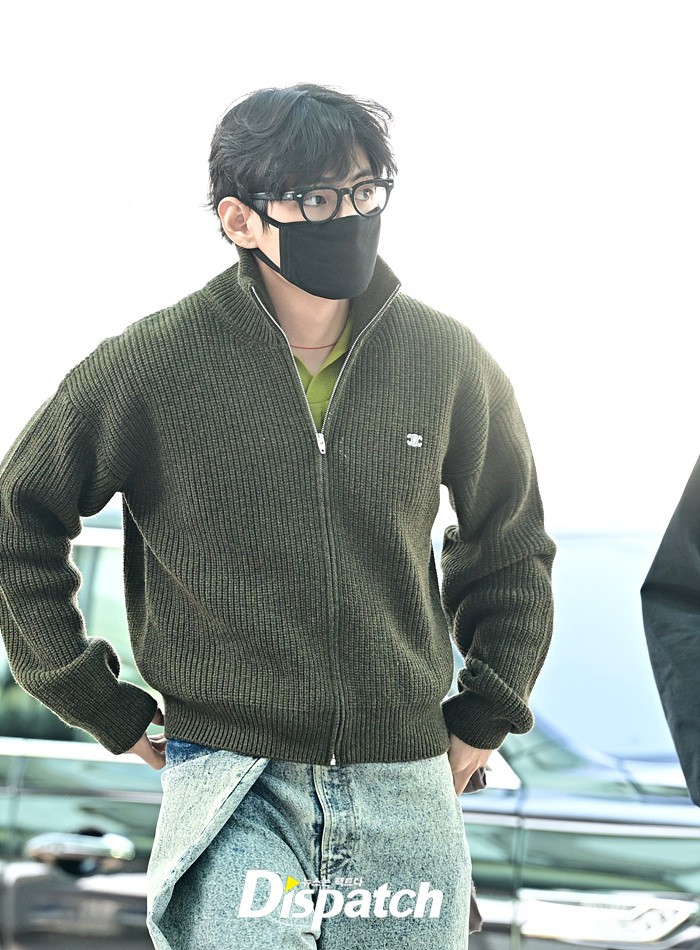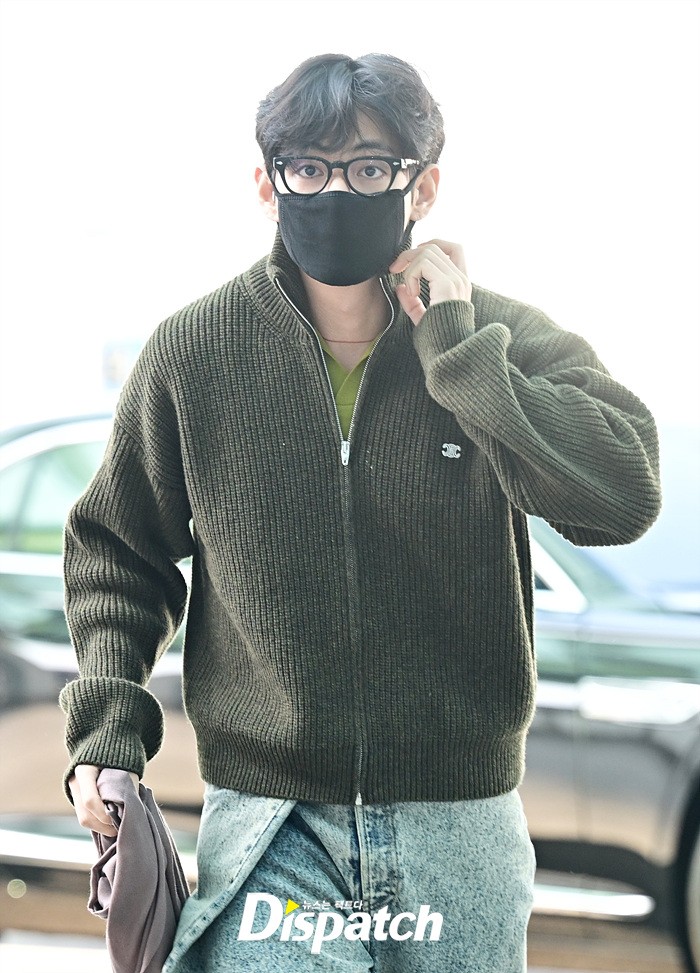 뷔는 니트집업과 데님 와이드 팬츠로 캐주얼한 공항패션을 연출했다. 마스크에도 또렷한 비주얼이 돋보였다.