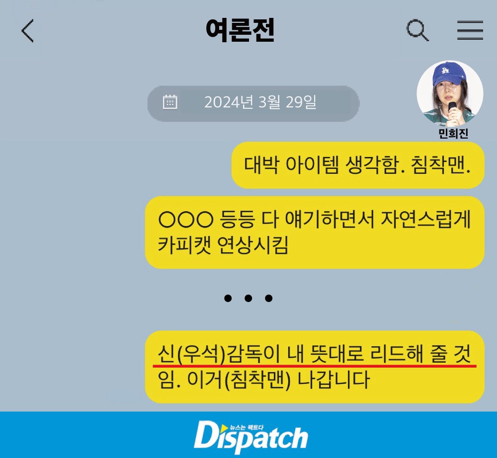 민희진은 여론전에 자신의 우군도 활용했다. 유튜브 '침착맨' 출연도 마찬가지. 그는 "자연스럽게 카피캣을 연상시키게 하자"면서 "신우석 감독이 내 뜻대로 리드해줄 것"이라 말했다.