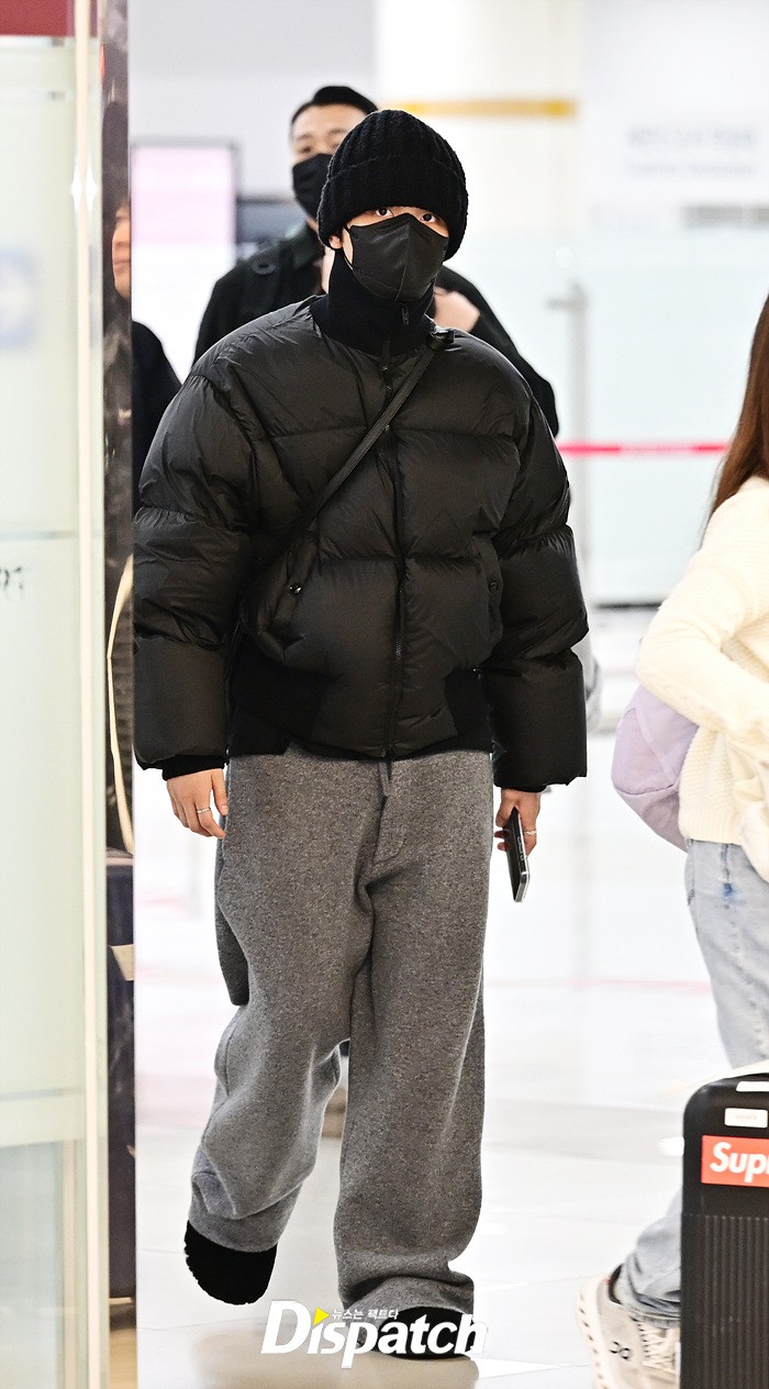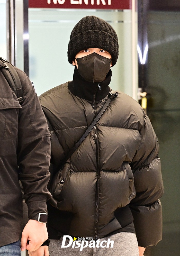 해찬은 트레이닝룩으로 심플한 공항패션을 완성했다. 비니와 마스크에도 강렬한 눈빛이 돋보였다.
