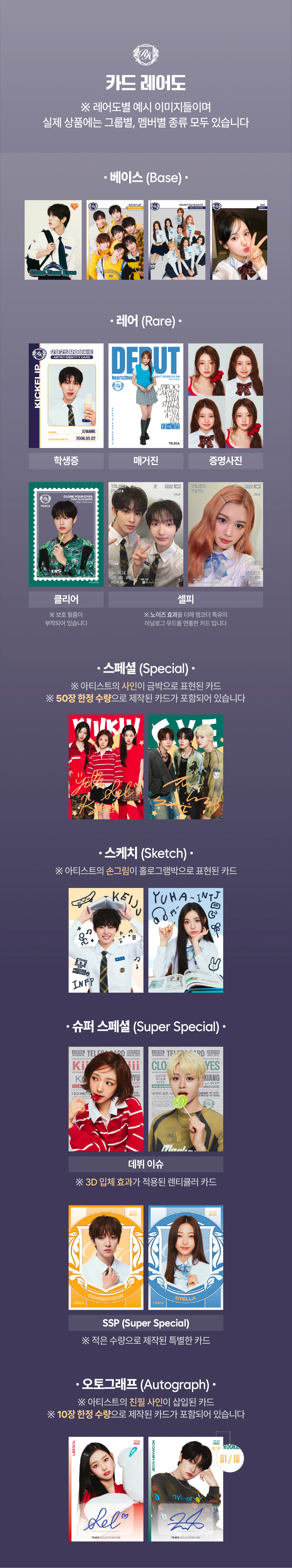 테레카 컬렉션 카드 세부 구성으로는 베이스(셀카, 유닛, 단체), 레어(증명사진, 학생증 등), 스페셜(사인), 스케치(손그림), 슈퍼 스페셜(렌티큘러, SSP), 오토그래프(친필 사인) 등이 있다.