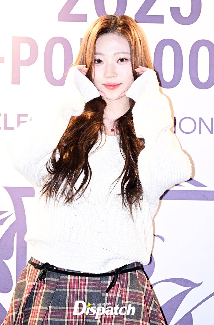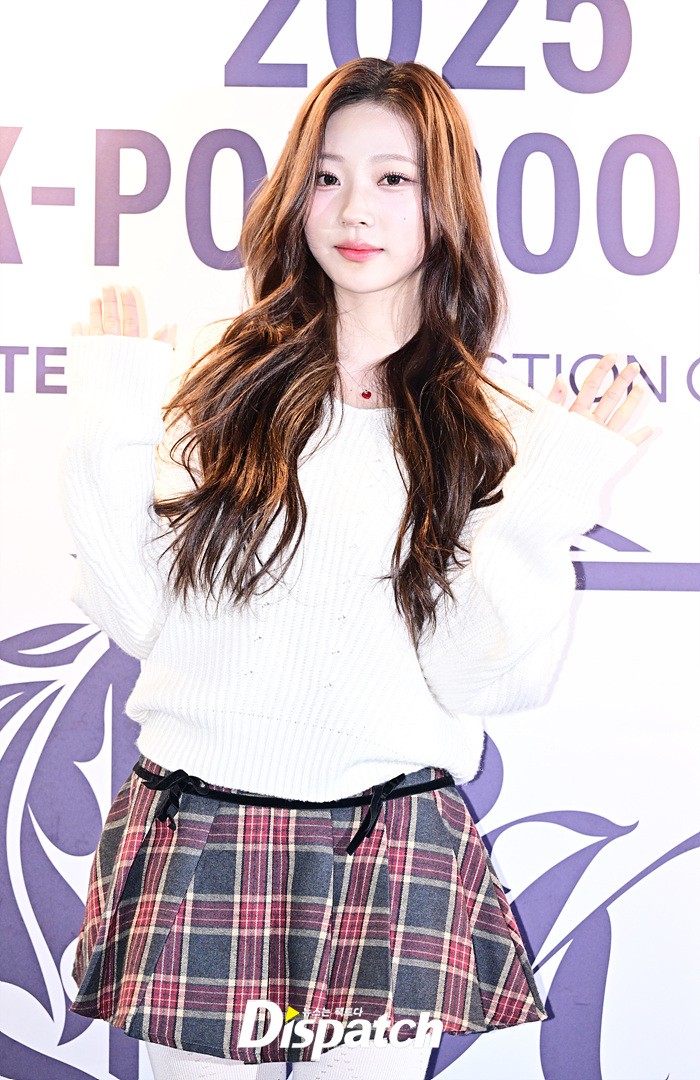 스텔라는 화이트 컬러의 니트와 체크 스커트로 캐주얼한 스타일링을 선보였다. 웨이브 헤어는 러블리한 매력을 더했다.