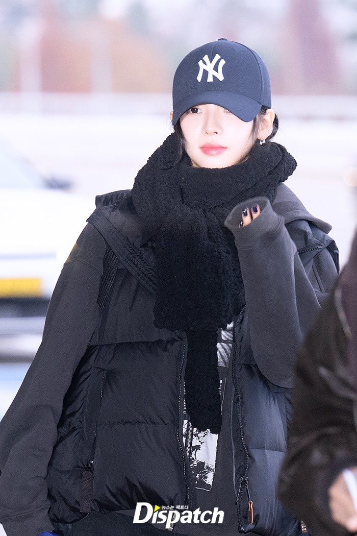 카리나는 블랙 팬츠에 패딩을 매치해 수수한 공항패션을 연출했다. 인형같은 미모가 돋보였다.