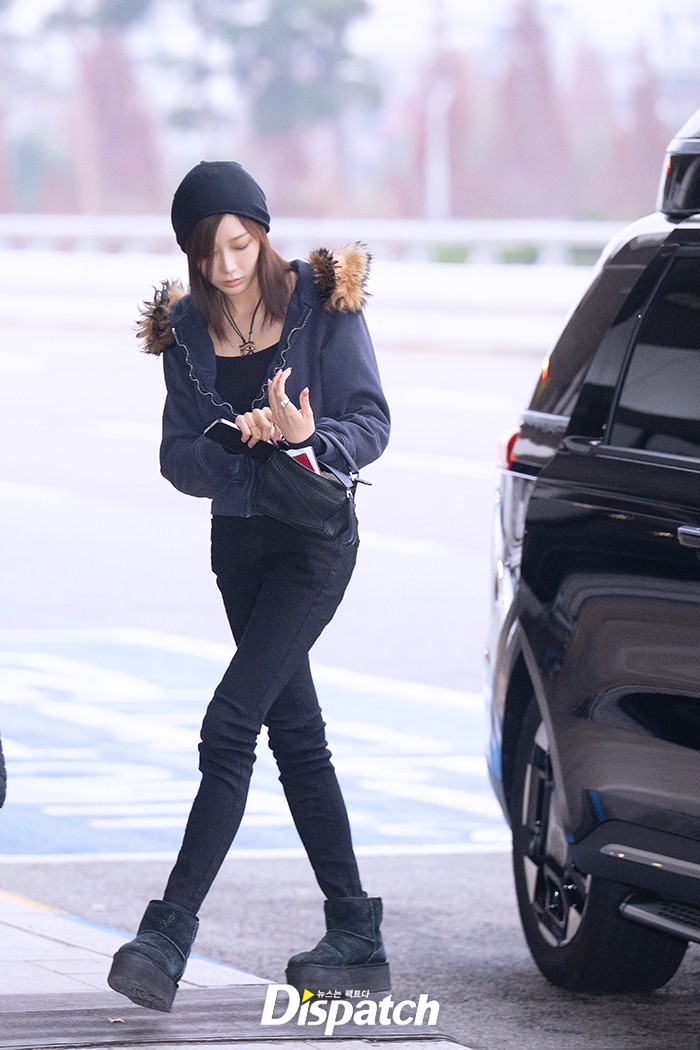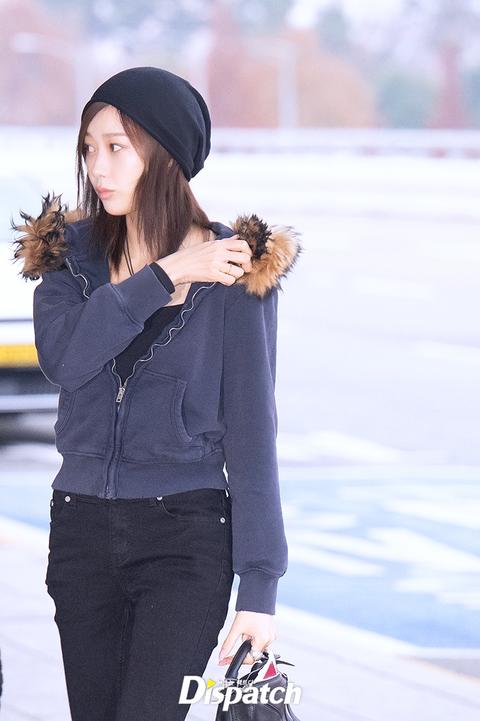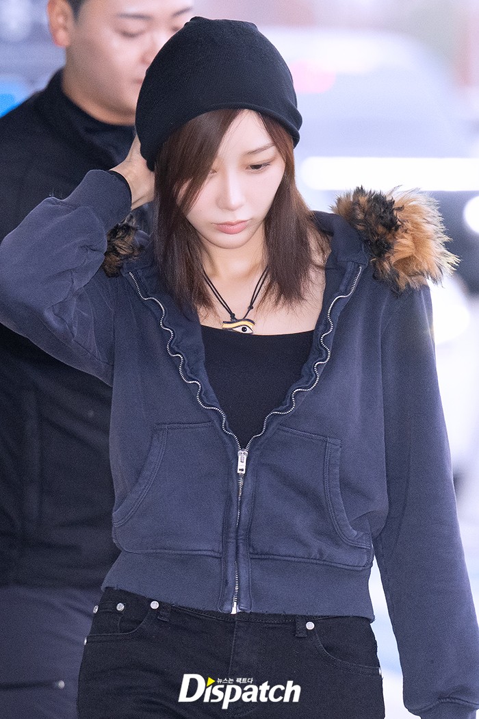 지젤은 블랙 팬츠에 후드를 매치해 수수한 공항패션을 연출했다. 인형같은 미모가 돋보였다.