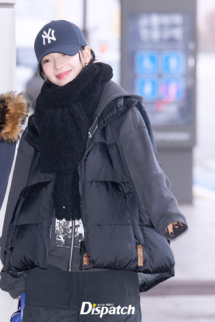 카리나는 블랙 팬츠에 패딩을 매치해 수수한 공항패션을 연출했다. 인형같은 미모가 돋보였다.