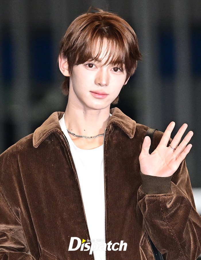 한진은 조각같은 비주얼로 눈길을 끌었다. 공항에 모인 팬들을 위해 환한 손인사로 화답했다.