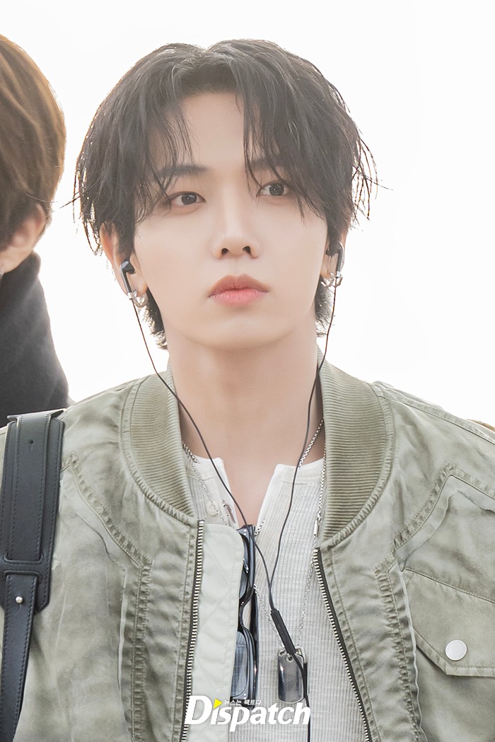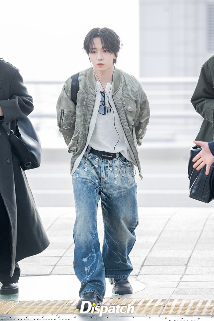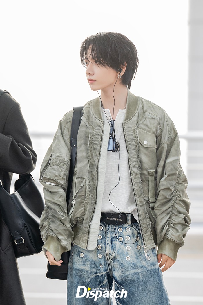 명재현은 셔링 포인트의 점퍼와 데님 팬츠로 공항패션을 연출했다. 잘생긴 비주얼이 돋보였다.