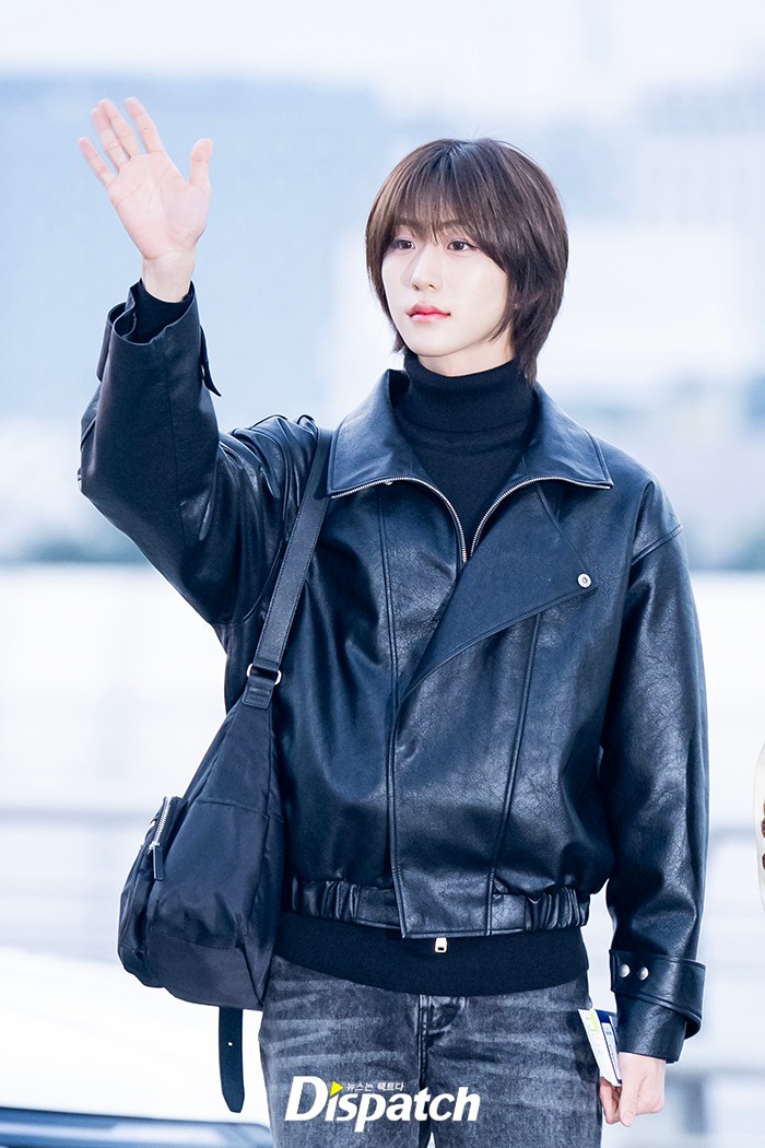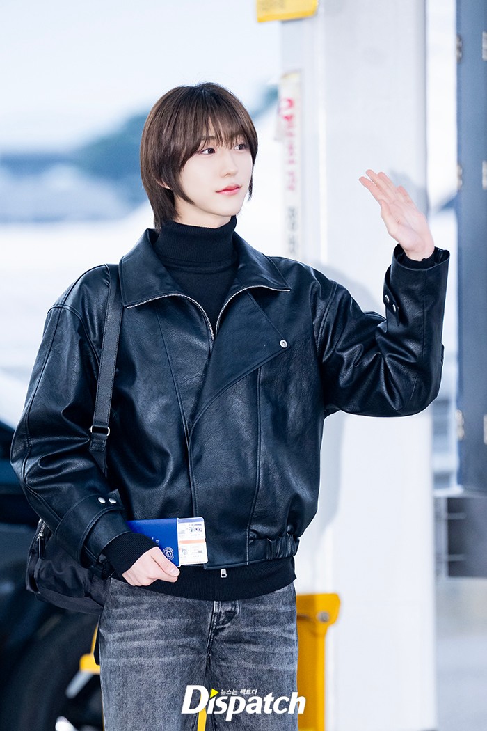 박원빈은 레더 재킷과 블랙 데님팬츠로 공항패션을 연출했다. 잘생긴 비주얼이 돋보였다.