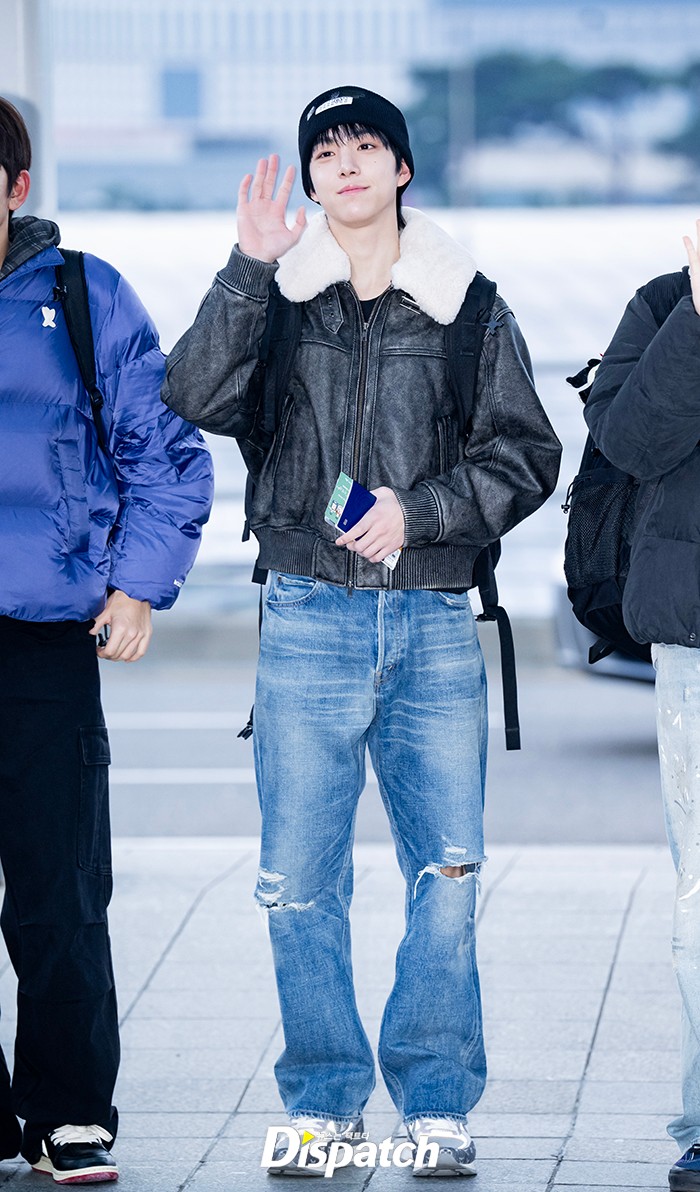 백준혁은 레더 재킷과 데님팬츠로 공항패션을 연출했다. 잘생긴 비주얼이 돋보였다.