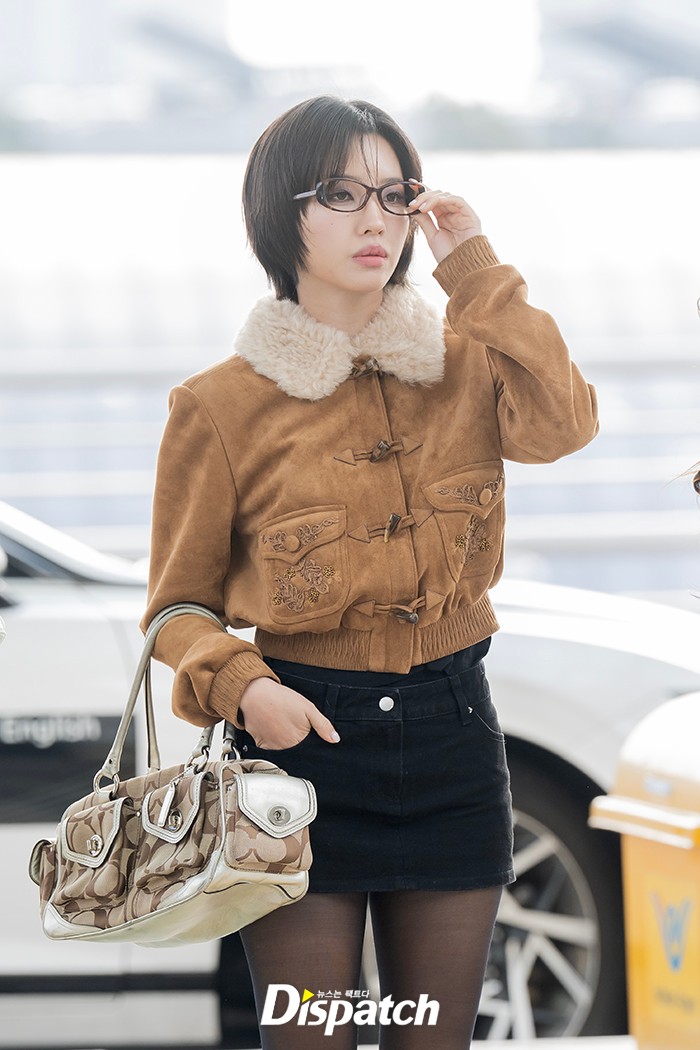 소연은 스웨이드 숏재킷과 미니 스커트로 겨울 패션을 완성했다. 시크한 매력이 묻어났다.