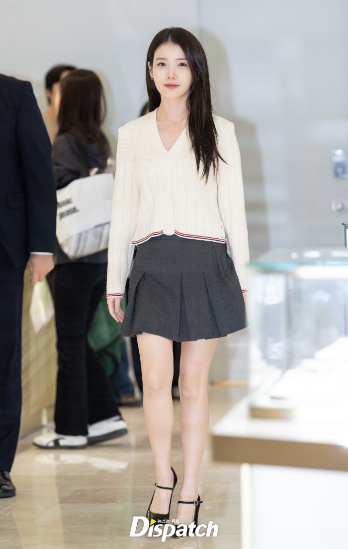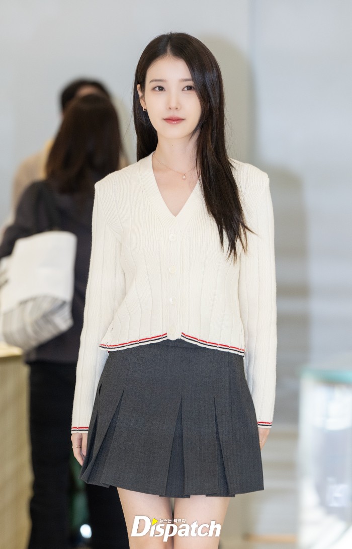 아이유는 화이트 카디건과 미니스커트로 맵시를 뽐냈다. 인형 비주얼로 남심을 사로잡았다.