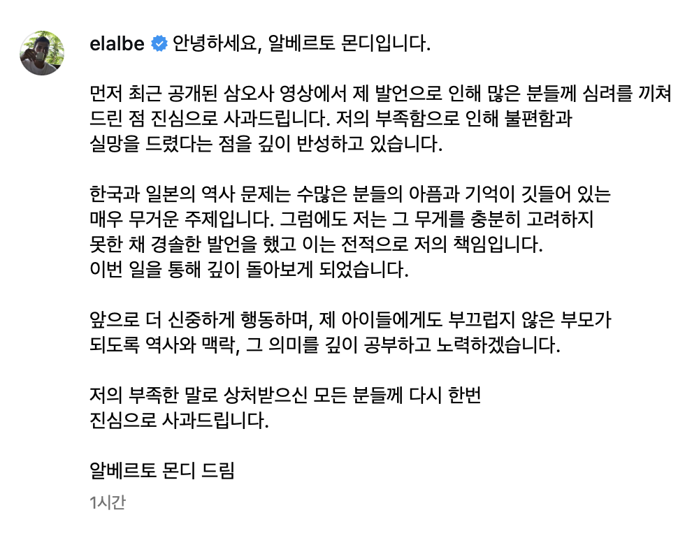 알베르토는 26일 인스타그램에 "최근 공개된 유튜브 '삼오사' 영상에서 제 발언으로 인해 많은 분께 심려를 끼쳐 드린 점 진심으로 사과드린다"고 고개 숙였다.
