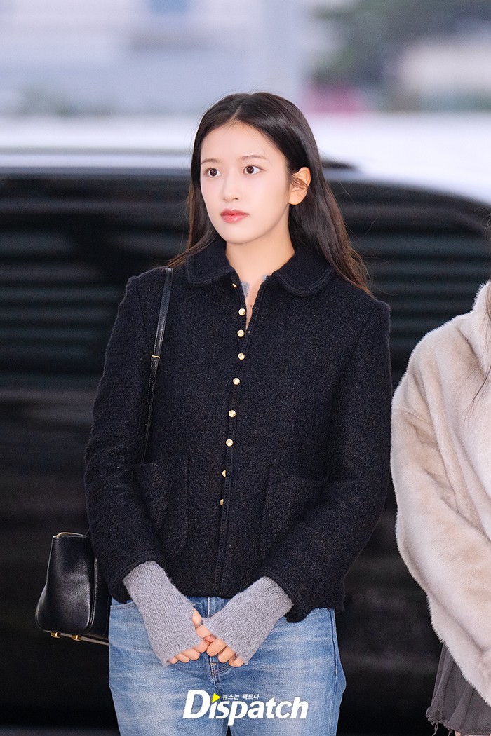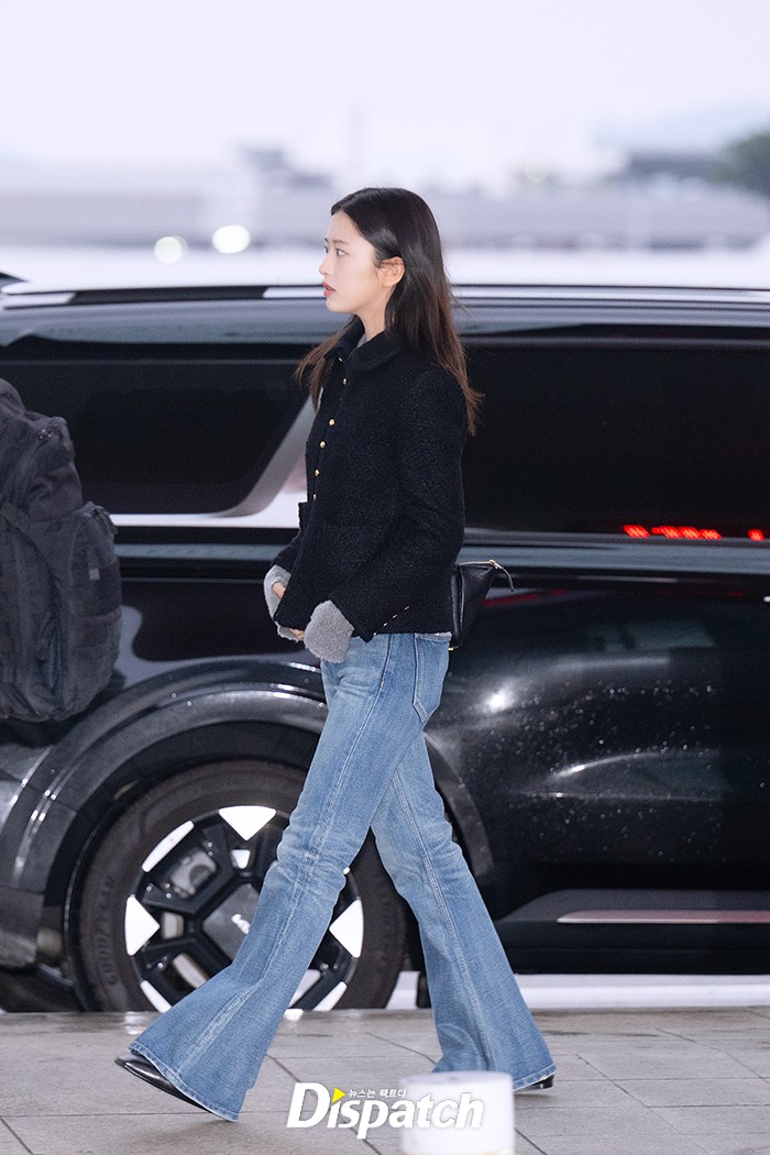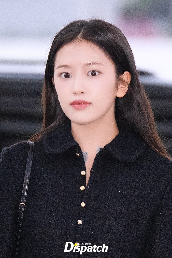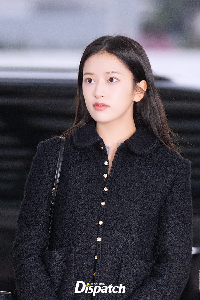 안유진은 데님 팬츠에 블랙 재킷으로 우아한 공항패션을 연출했다. 인형같은 미모가 돋보였다.