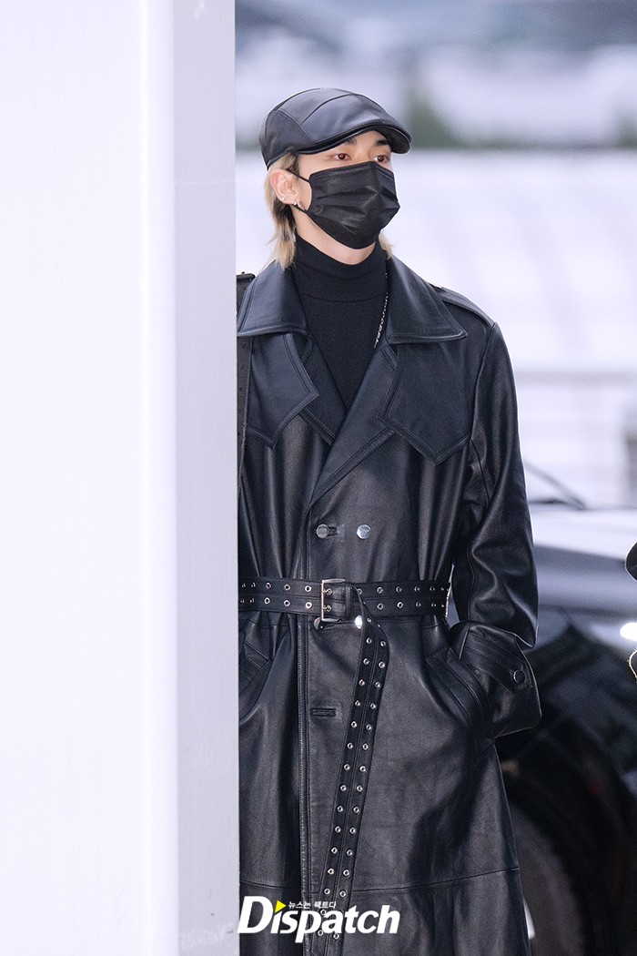 현진은 블랙 팬츠에 레더 코트로 시크한 공항패션을 연출했다. 조각같은 비주얼이 돋보였다.