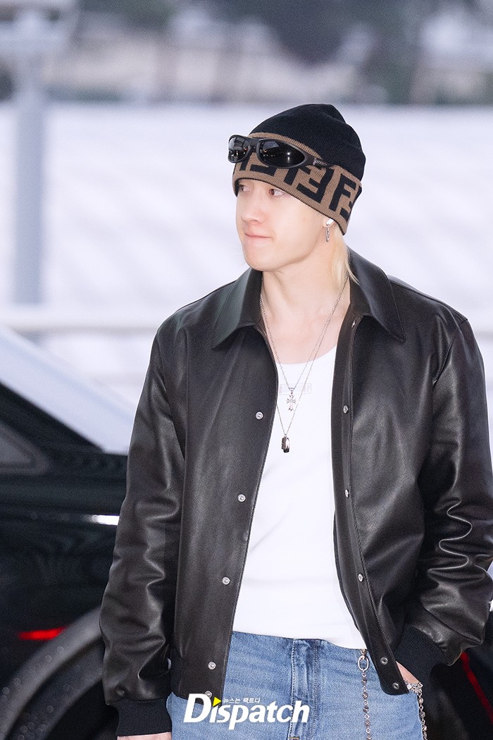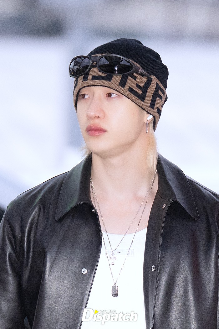 방찬은 데님 팬츠에 레더 재킷으로 시크한 공항패션을 연출했다. 조각같은 비주얼이 돋보였다.