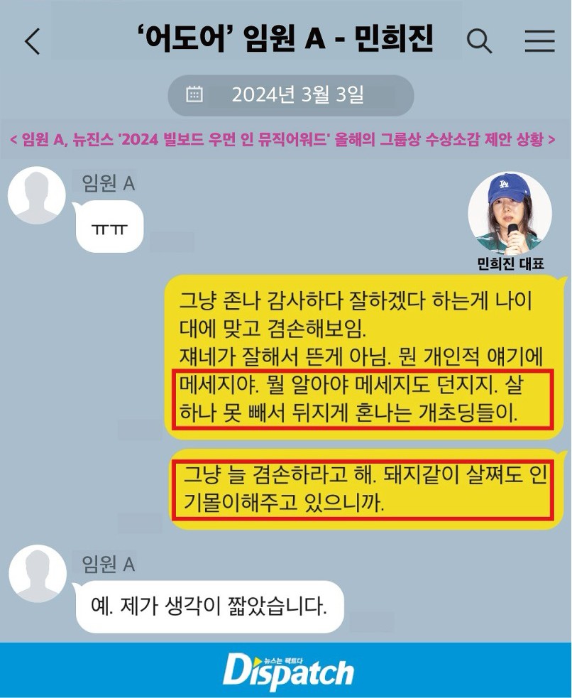 민희진 : 이게 답변이에요. 이상우가 변심해서 죄송하다고 했어요.