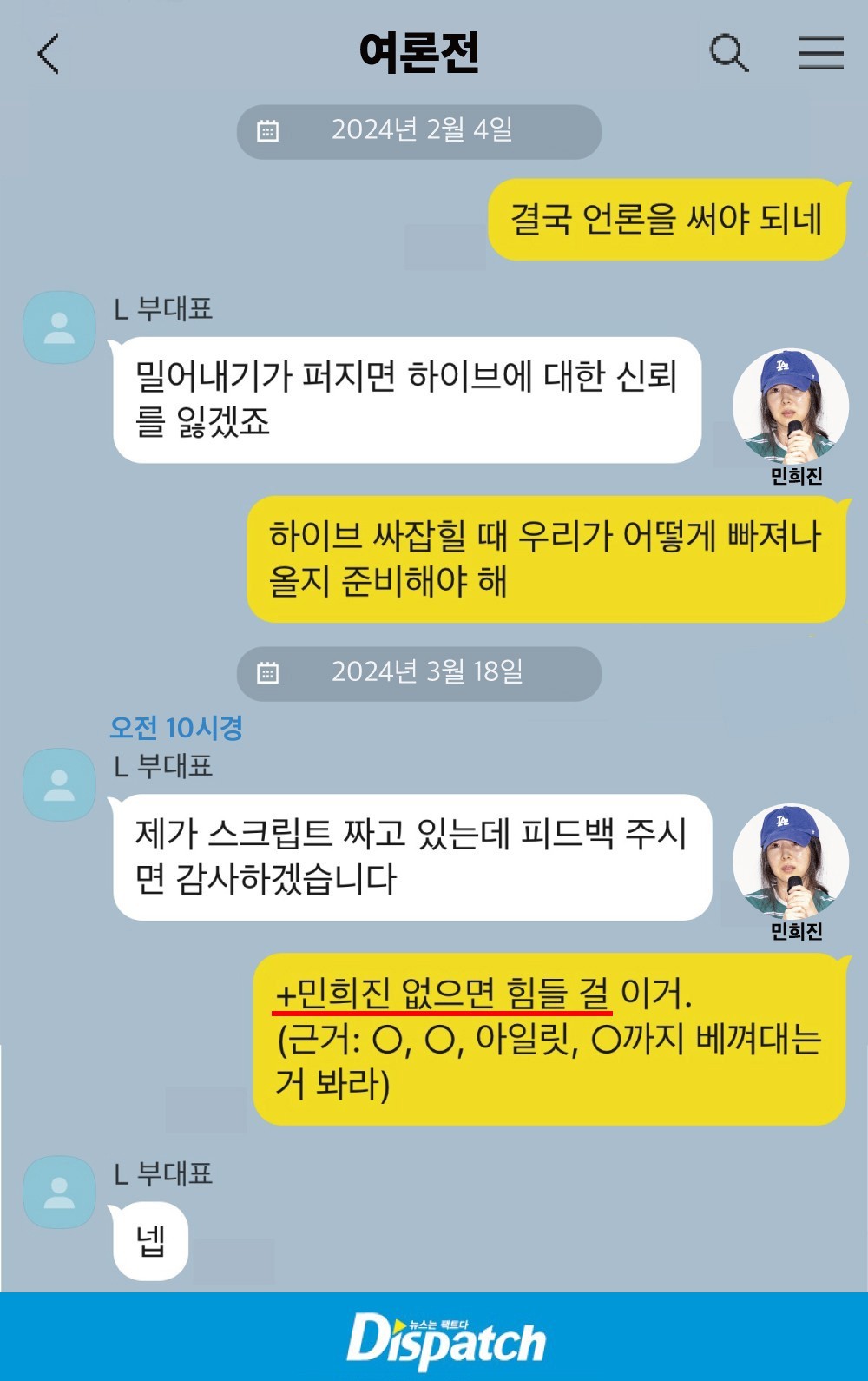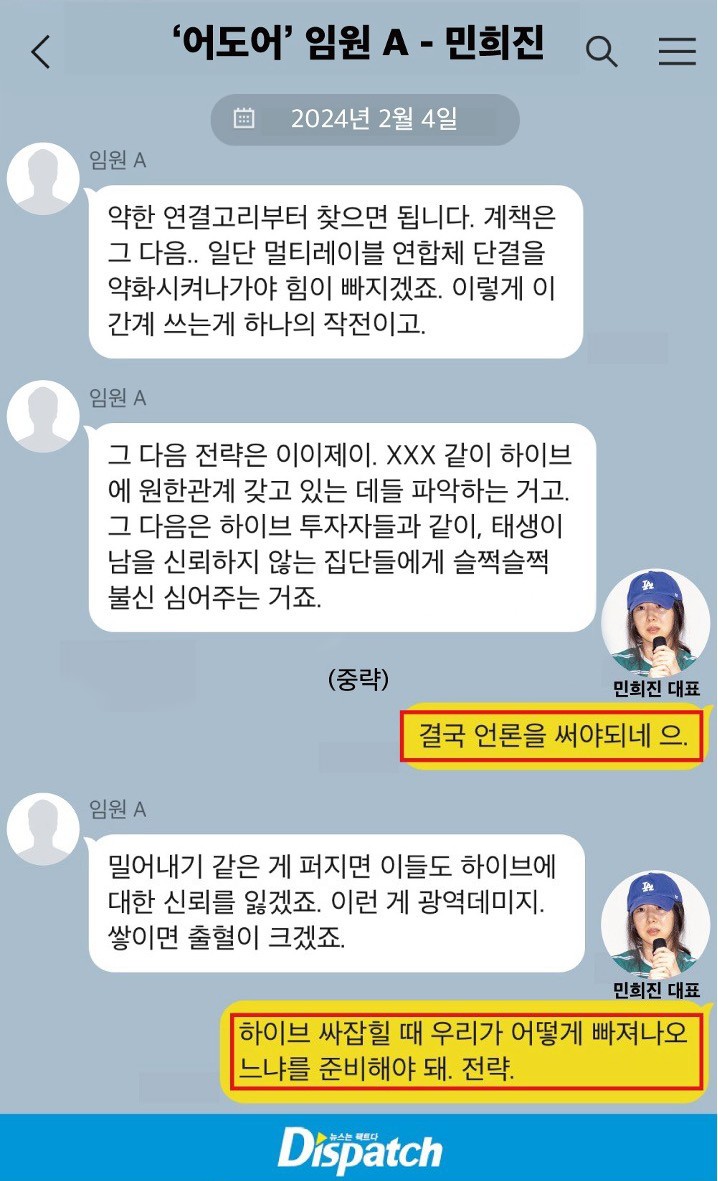 민희진 : 저런 이야기를 했을 때 포커스는 독립이나 공격이 아니다. 아일릿 카피 이슈에 대해 어떻게 싸워야 하는지가 포커스다.