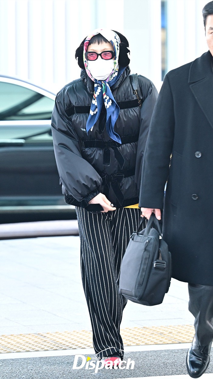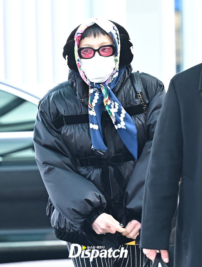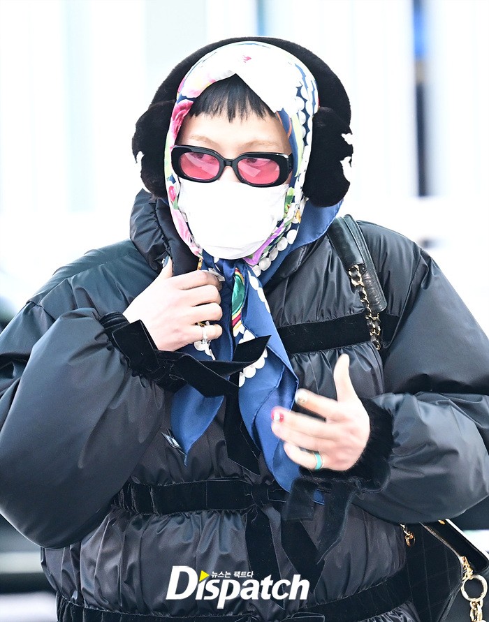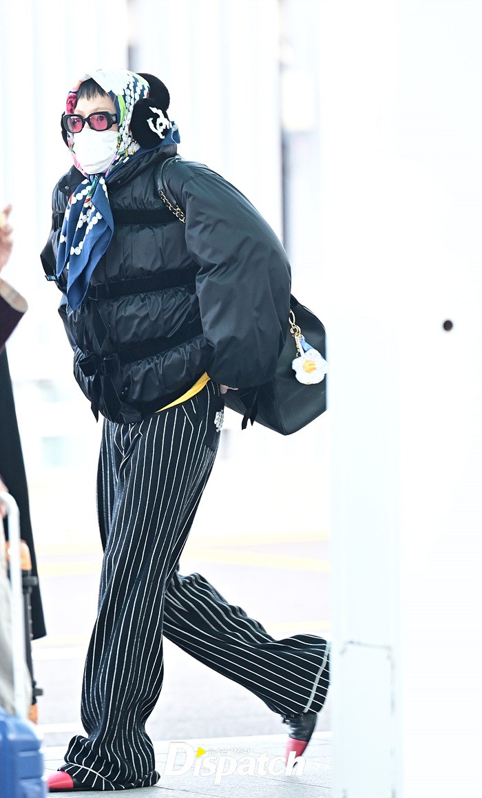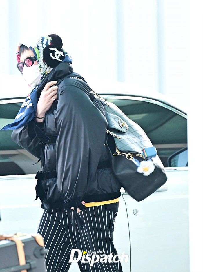 지드래곤은 올블랙룩으로 시크한 공항패션을 연출했다. 핑크빛 선글라스와, 두건, 빅백으로 독특한 스타일링을 완성했다.