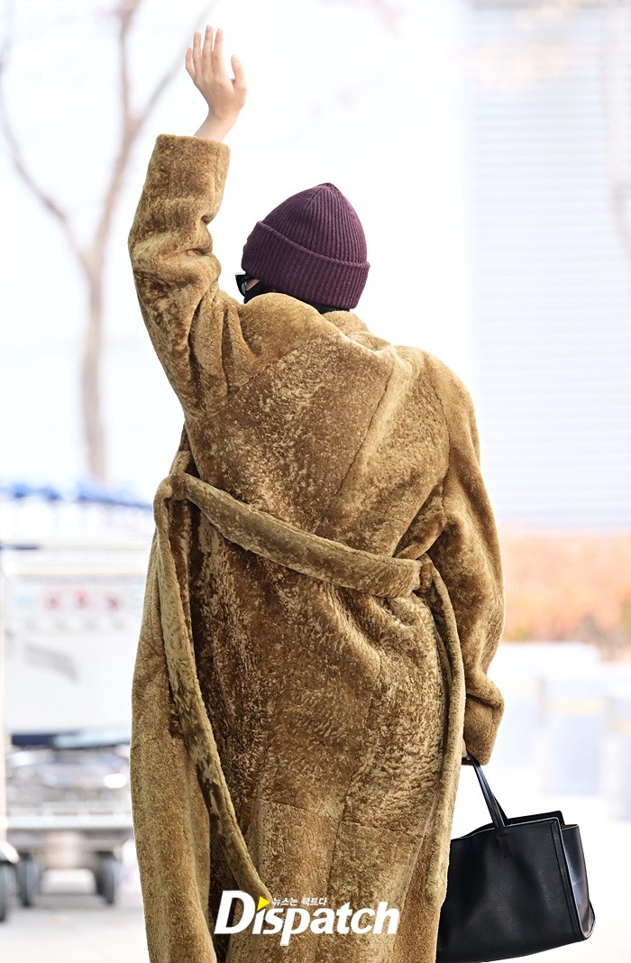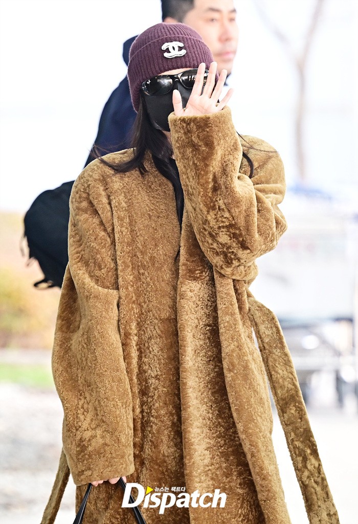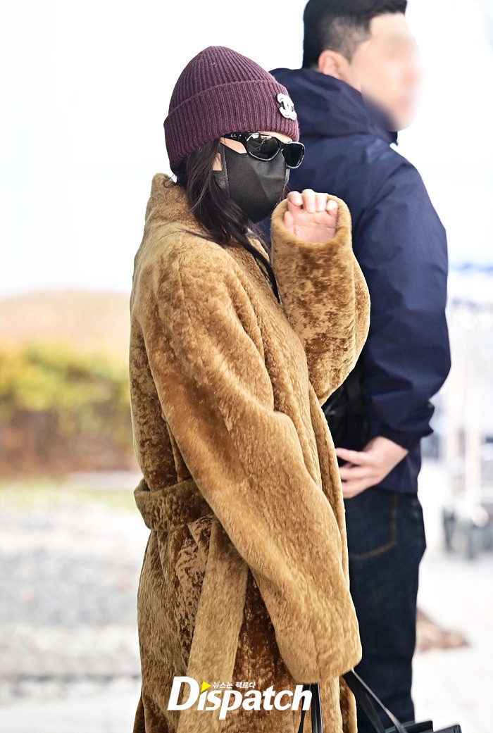 제니는 브라운 컬러의 퍼코트로 세련된 공항패션을 완성했다. 마스크에도 독보적인 아우라가 눈길을 끌었다.