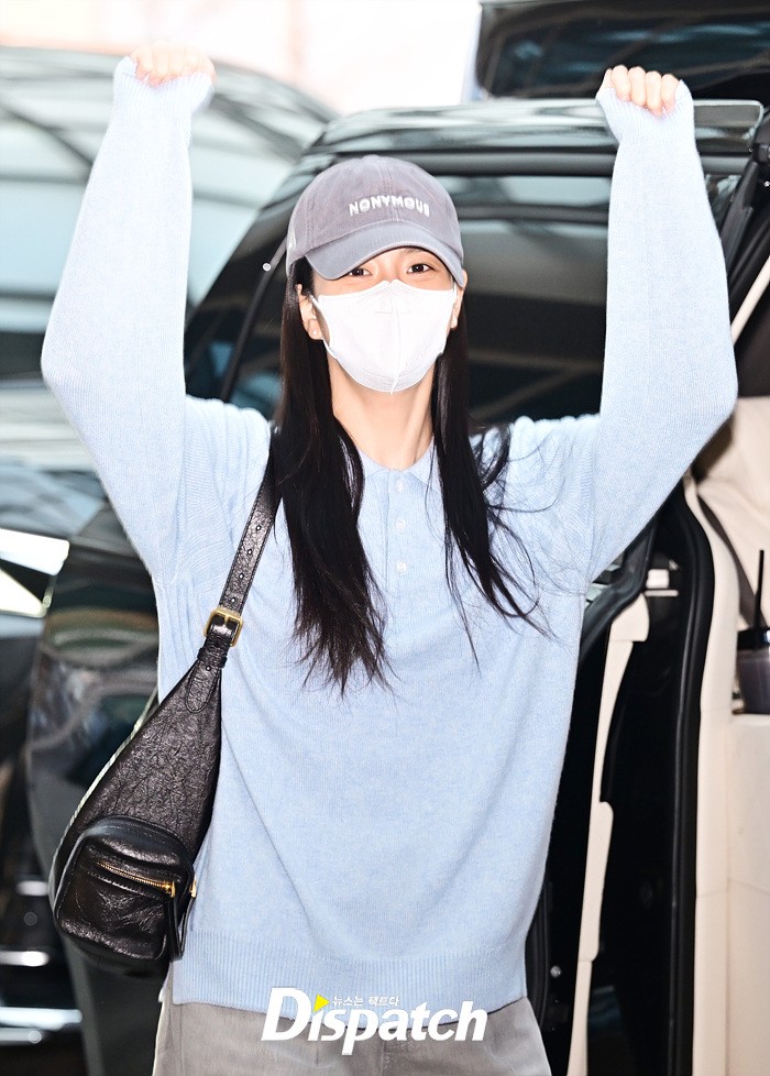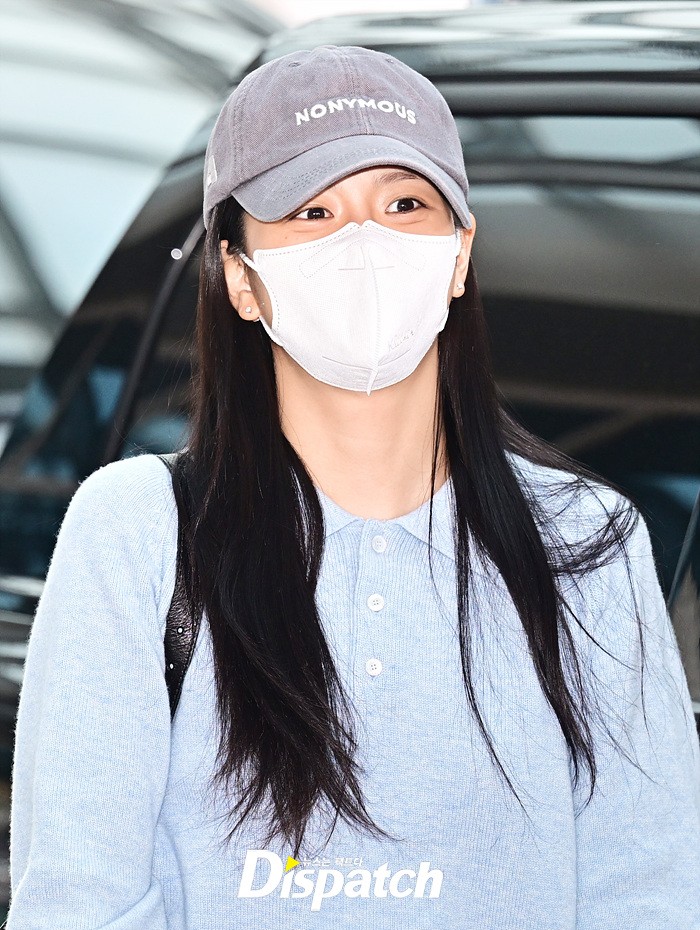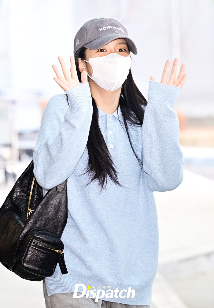 지수는 니트와 데님진으로 캐주얼한 공항패션을 완성했다. 마스크에도 또렷한 이목구비가 돋보였다.
