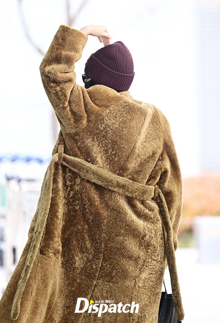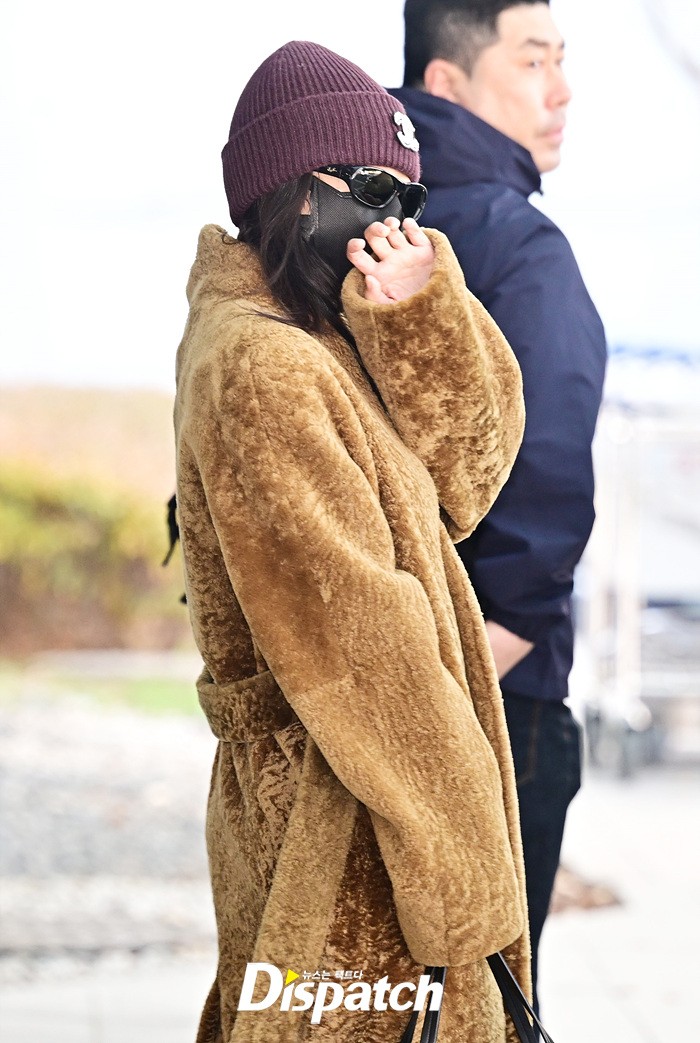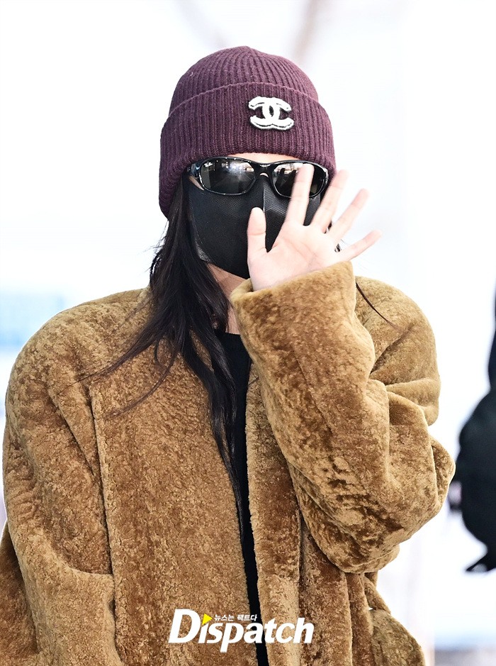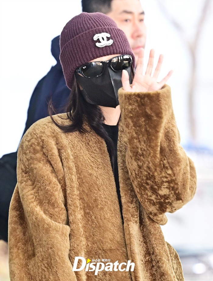 제니는 브라운 컬러의 퍼코트로 세련된 공항패션을 완성했다. 마스크에도 독보적인 아우라가 눈길을 끌었다.
