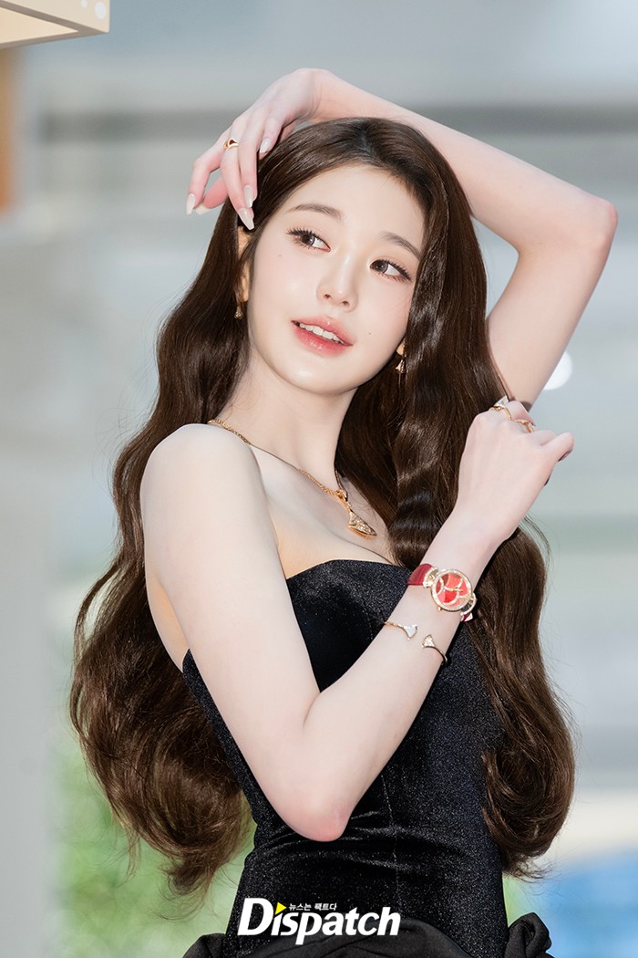 장원영은 블랙 튜브톱 미니드레스로 아름다운 자태를 뽐냈다.