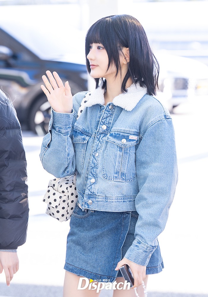 지유는 청자켓 청스커트로 청청패션을 보여줬다. 아름다운 미모로 남심을 사로잡았다.