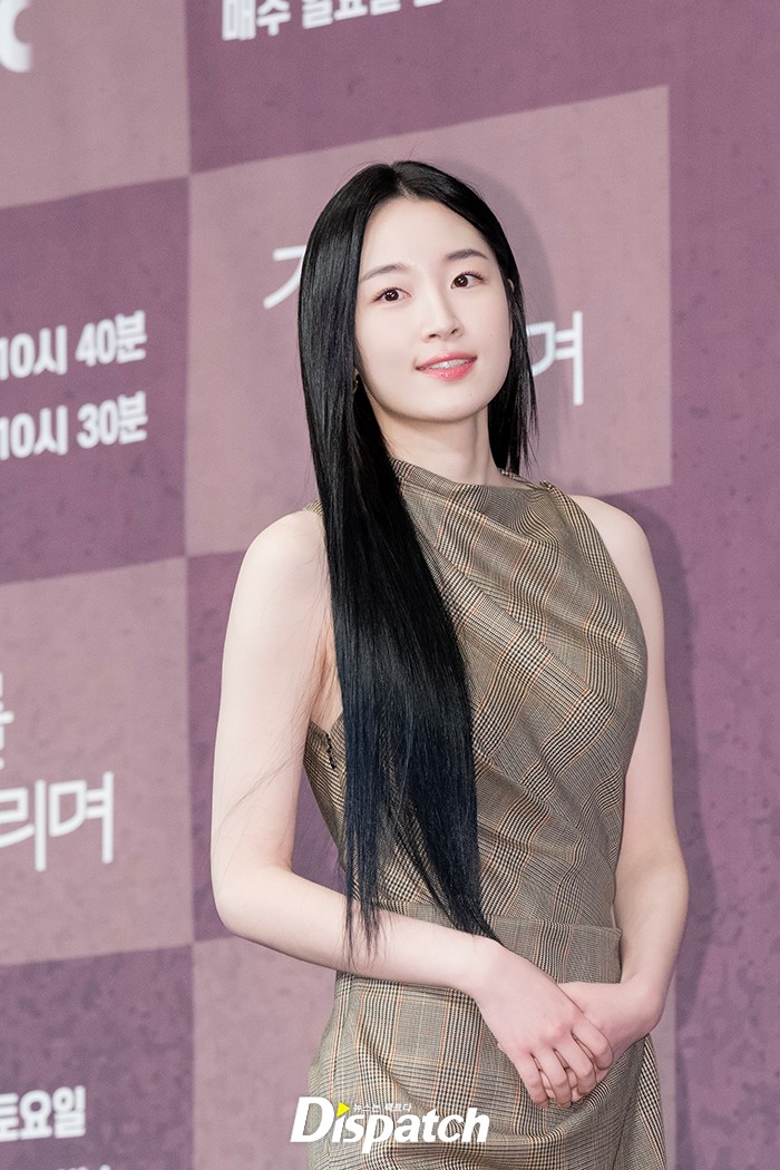원지안은 체크무늬 슬리브리스 원피스로 멋을 냈다. 긴생머리 헤어스타일로 청순미를 더했다.