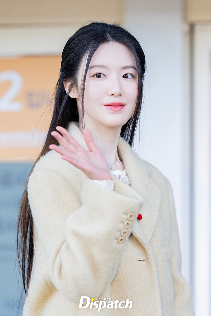 슈화는 옐로우 코트와 체크 스커트로 청순한 공항패션을 완성했다.