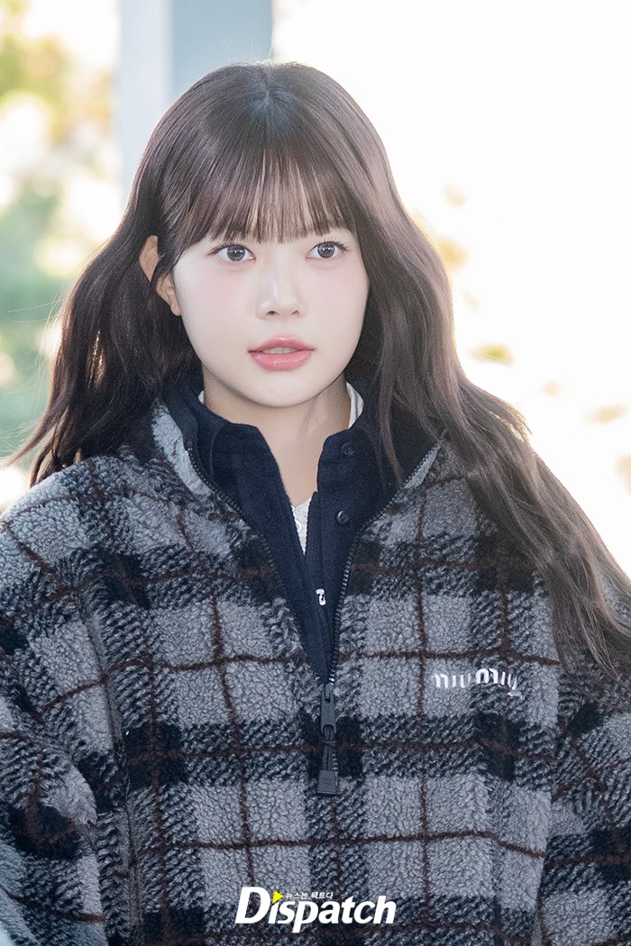 홍은채는 체크 점퍼와 미니스커트로 공항패션을 완성했다. 인형같은 미모가 돋보였다.
