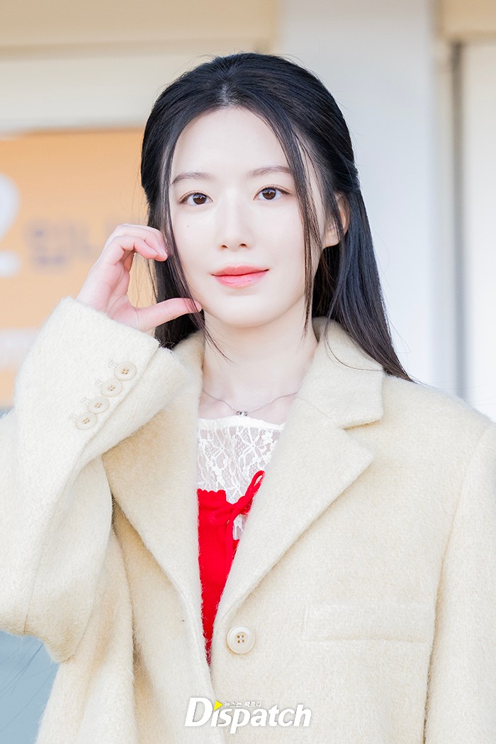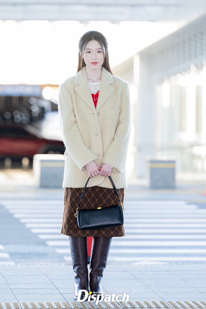슈화는 옐로우 코트와 체크 스커트로 청순한 공항패션을 완성했다.