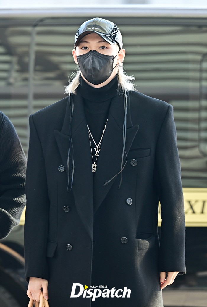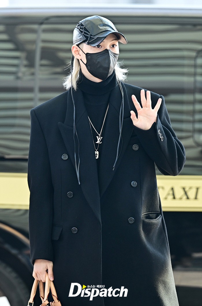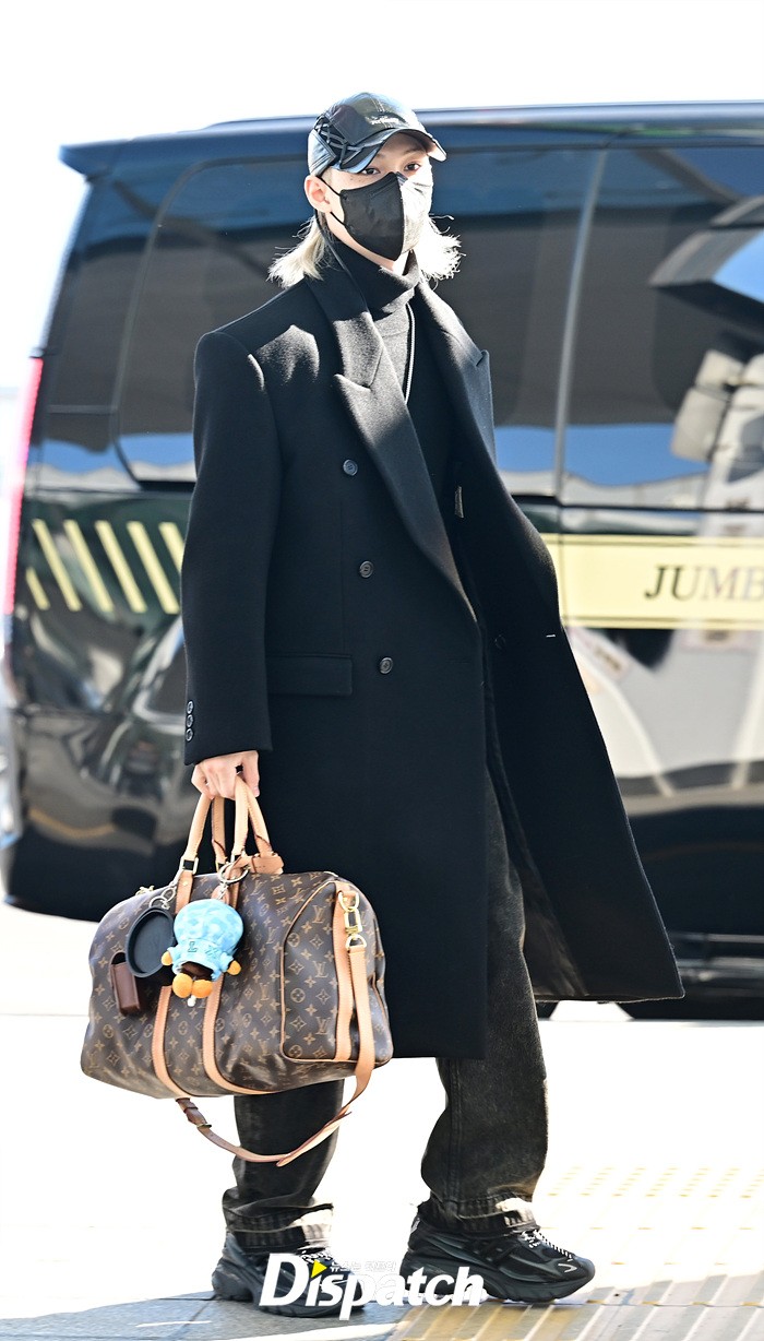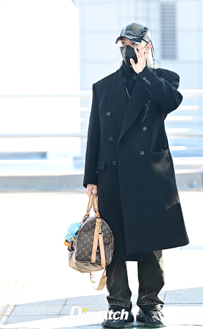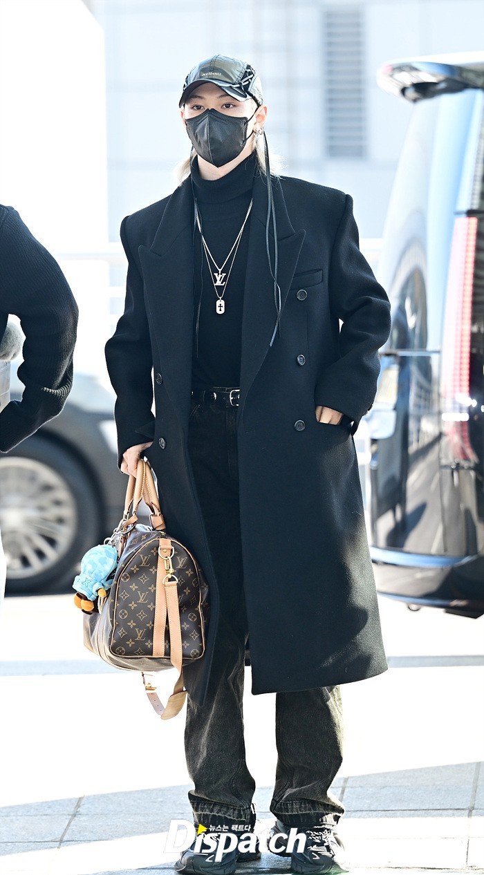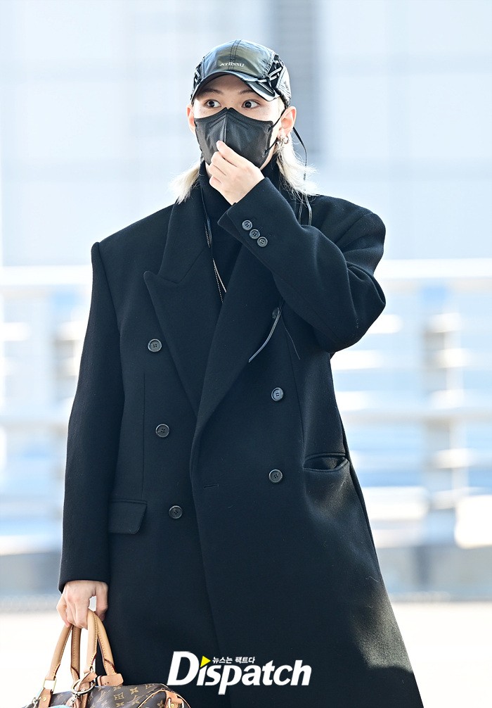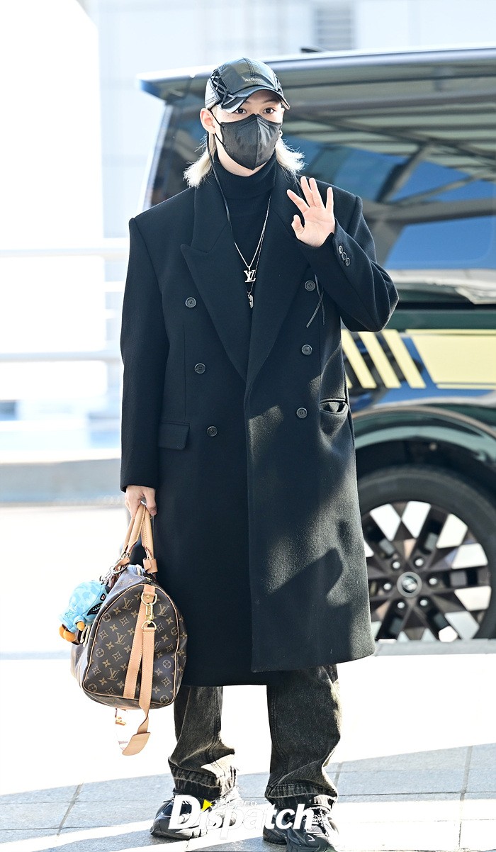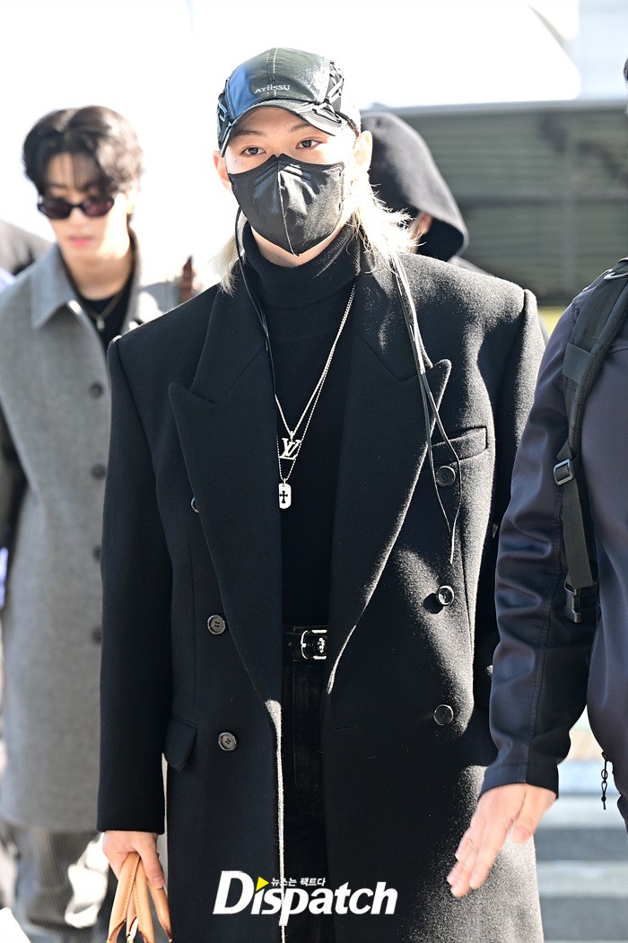 필릭스는 블랙 컬러의 롱코트로 댄디한 공항패션을 연출했다. 모자와 마스크에도 훈훈한 비주얼이 돋보였다.