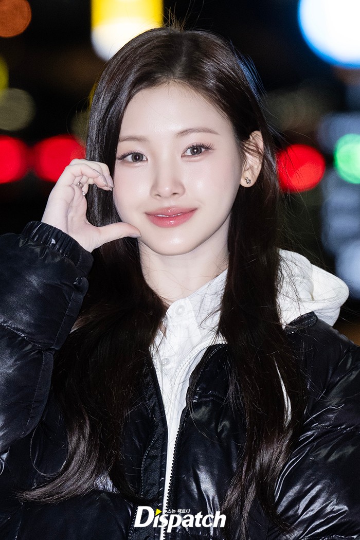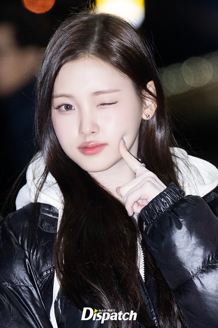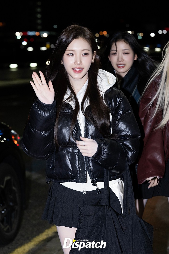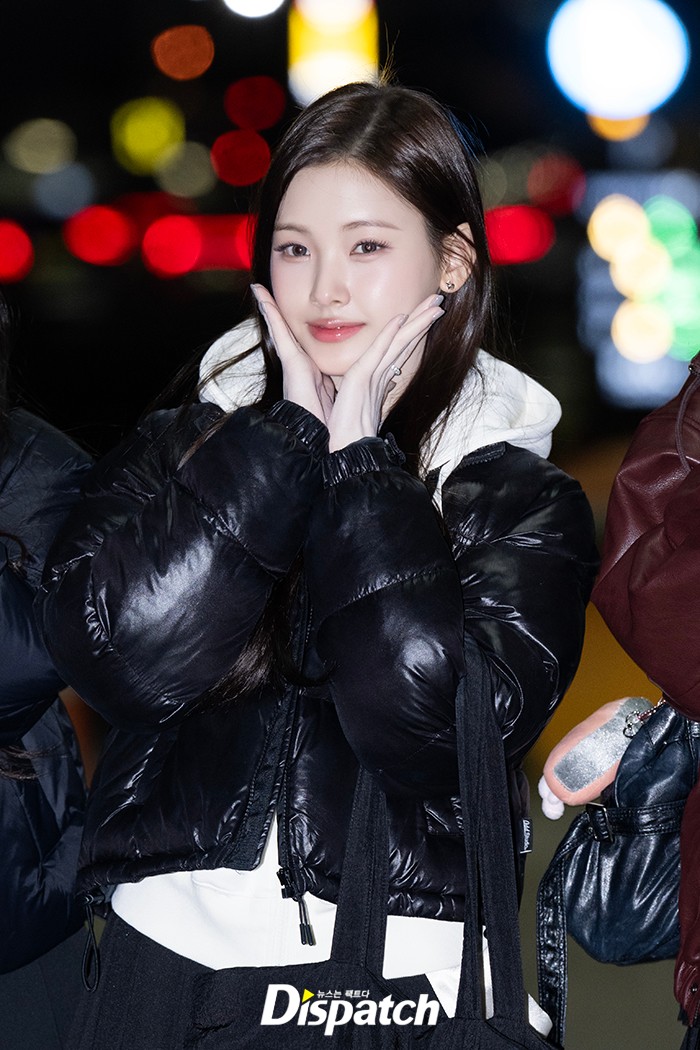 이현은 블랙 패딩 점퍼와 플레어 미니스커트로 멋을 냈다. 인형같은 미모가 시선을 사로잡았다.