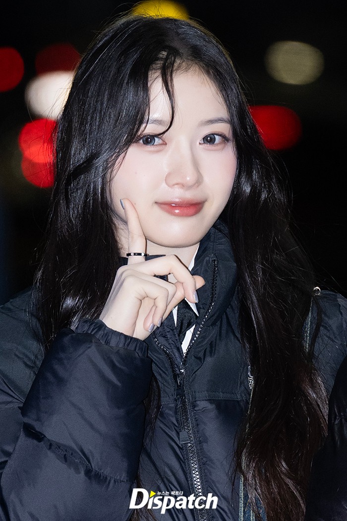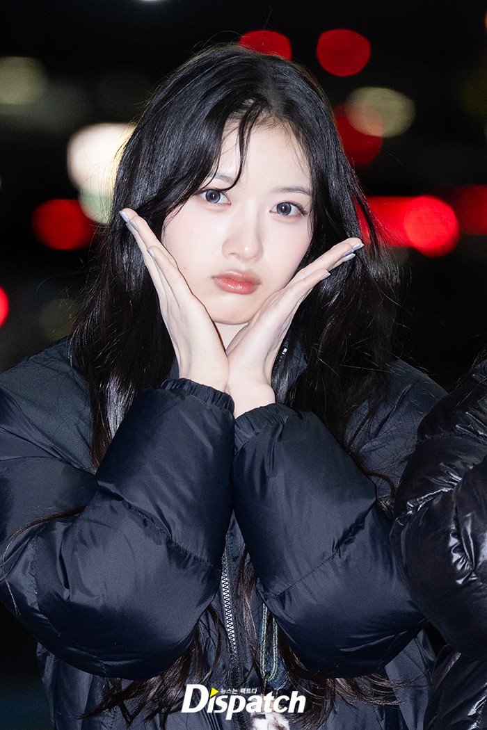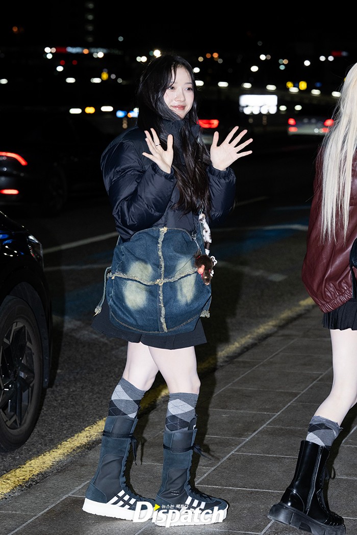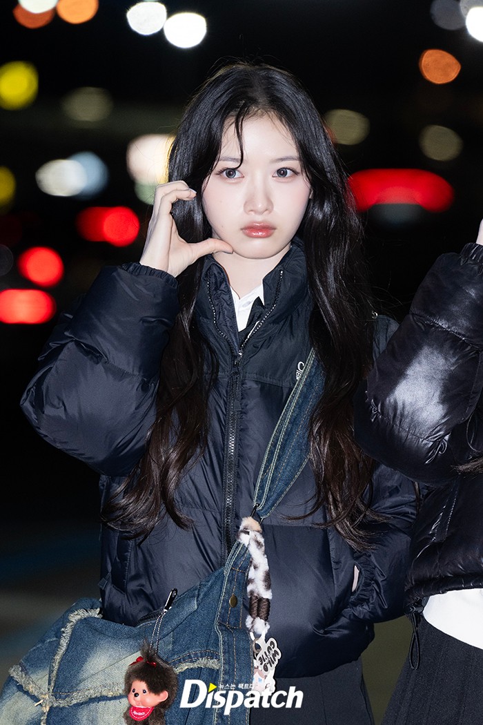 쿠미는 블랙 패딩 점퍼와 플레어 미니스커트로 멋을 냈다. 인형같은 미모가 시선을 사로잡았다.