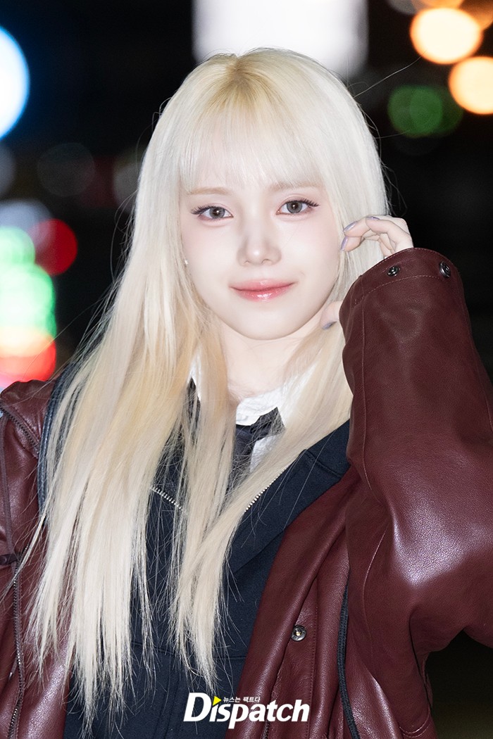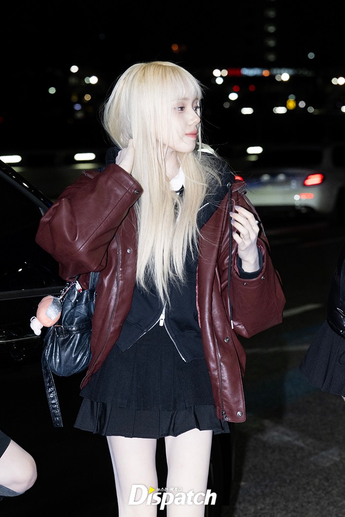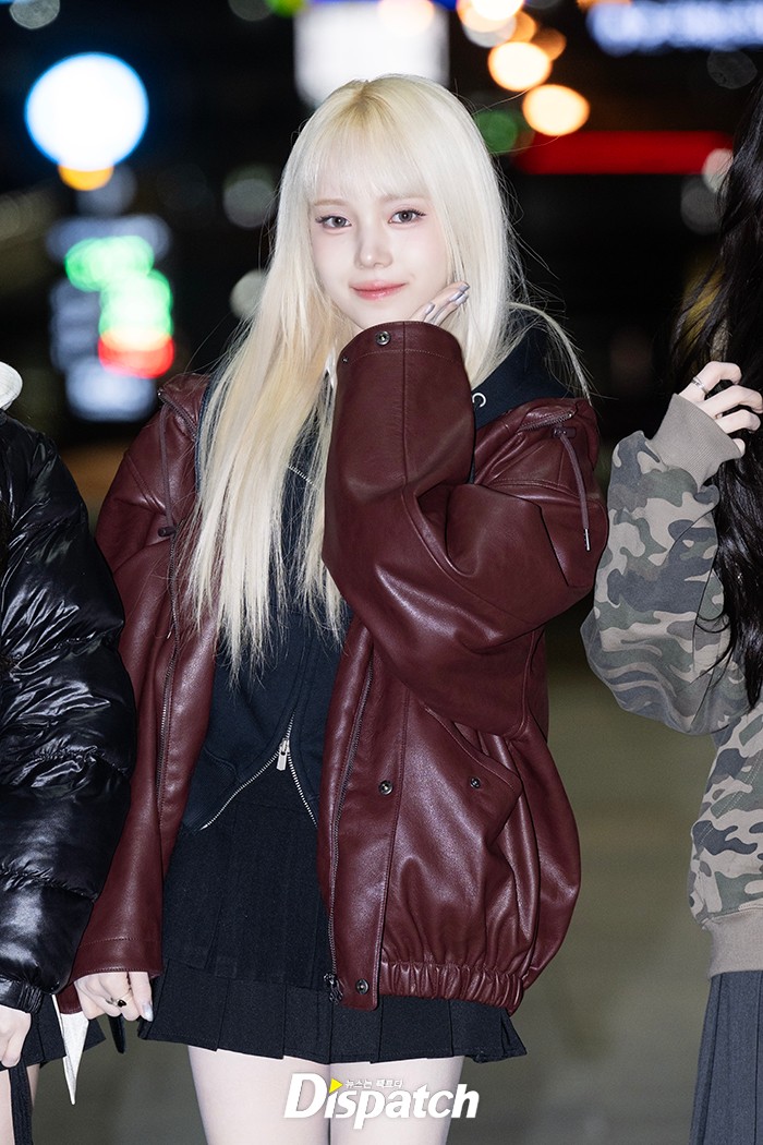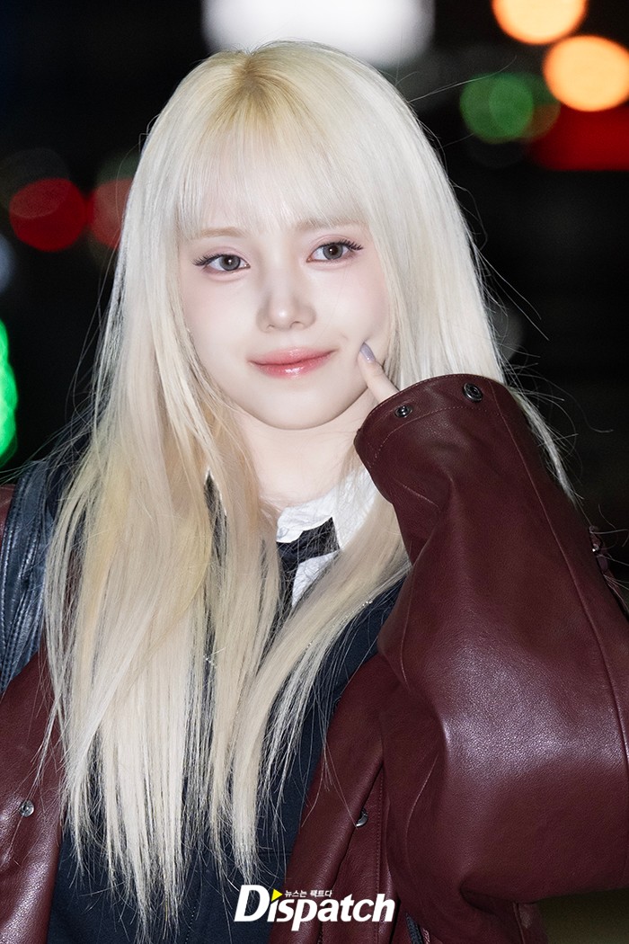 미아는 와인빛 레더 재킷과 미니스커트로 멋을 냈다. 인형같은 미모가 돋보였다.