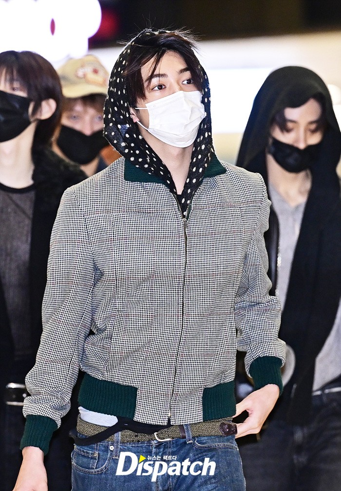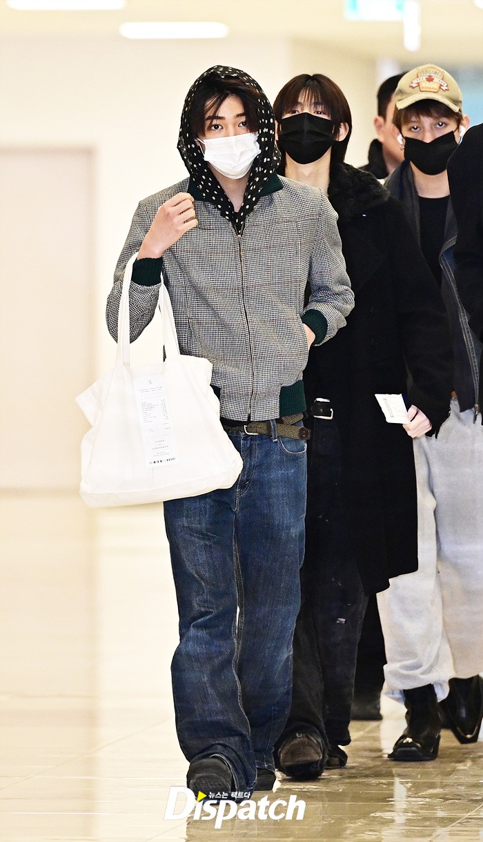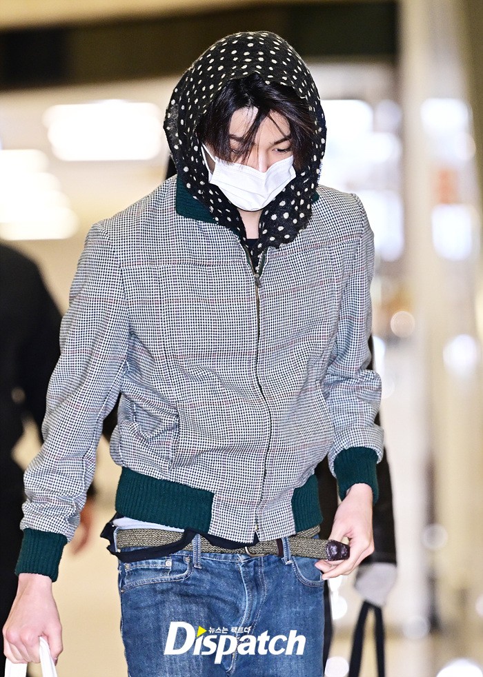 건호는 체크무늬 재킷과 데님진, 빅백으로 캐주얼한 공항패션을 완성했다. 마스크에도 훈훈한 비주얼이 돋보였다.
