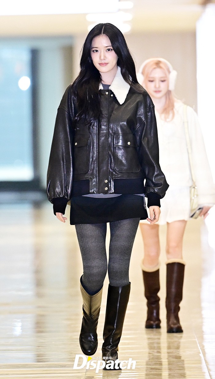 안유진은 가죽 재킷과 미니 스커트, 부츠로 센스있는 스타일링을 완성했다. 청순한 비주얼과 러블리한 미소가 돋보였다.