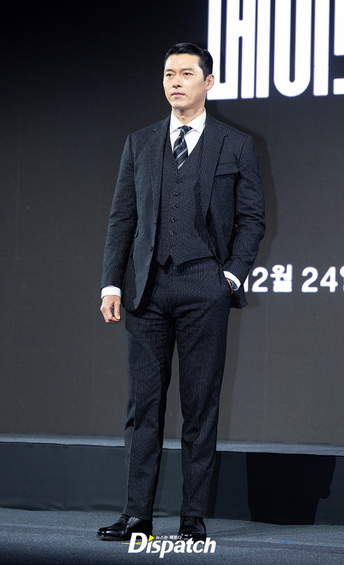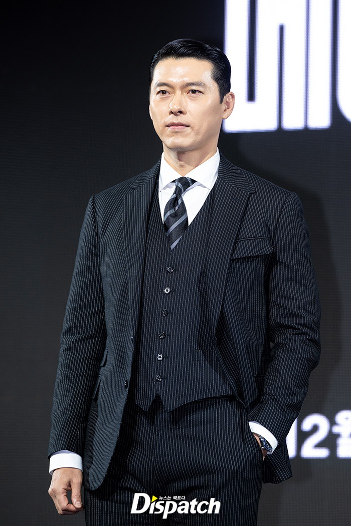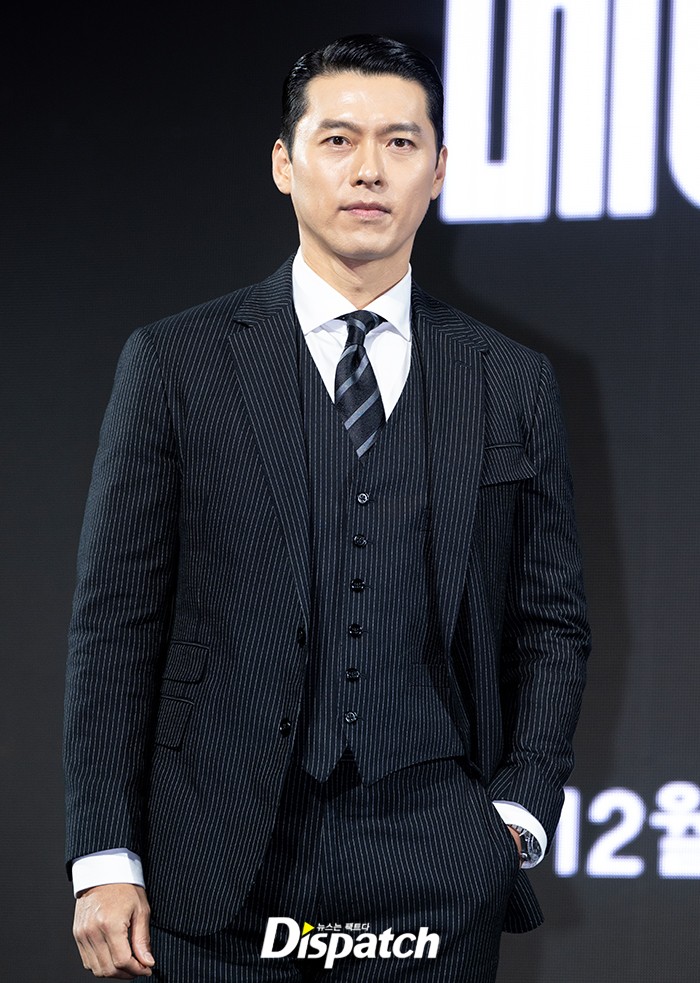 배우 현빈은 블랙 스트라이프 수트로 멋진 맵시를 뽐냈다. 완벽한 비주얼로 시선을 사로잡았다.