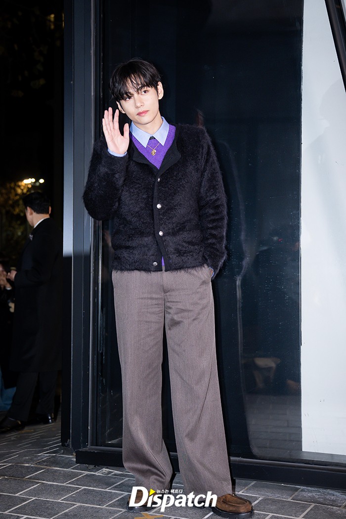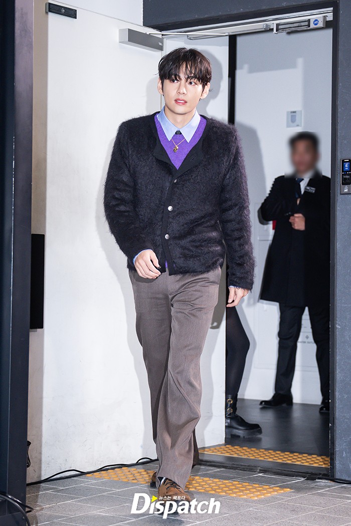 뷔는 블랙 가디건과 브라운 팬츠로 멋을 냈다. 잘생긴 비주얼이 돋보였다.