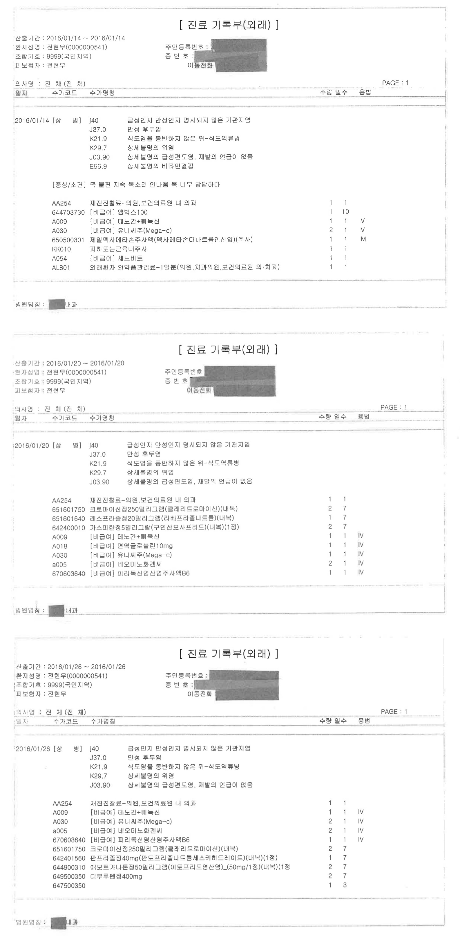 진료기록부에는 진료 일시와 환자 성명, 상병, 증상 내용, 병원명칭 등 치료와 관련된 기본 사항이 적혀 있었다. 수입금 통계지 역시 진료비 수납 내역이 기록돼 있었다.