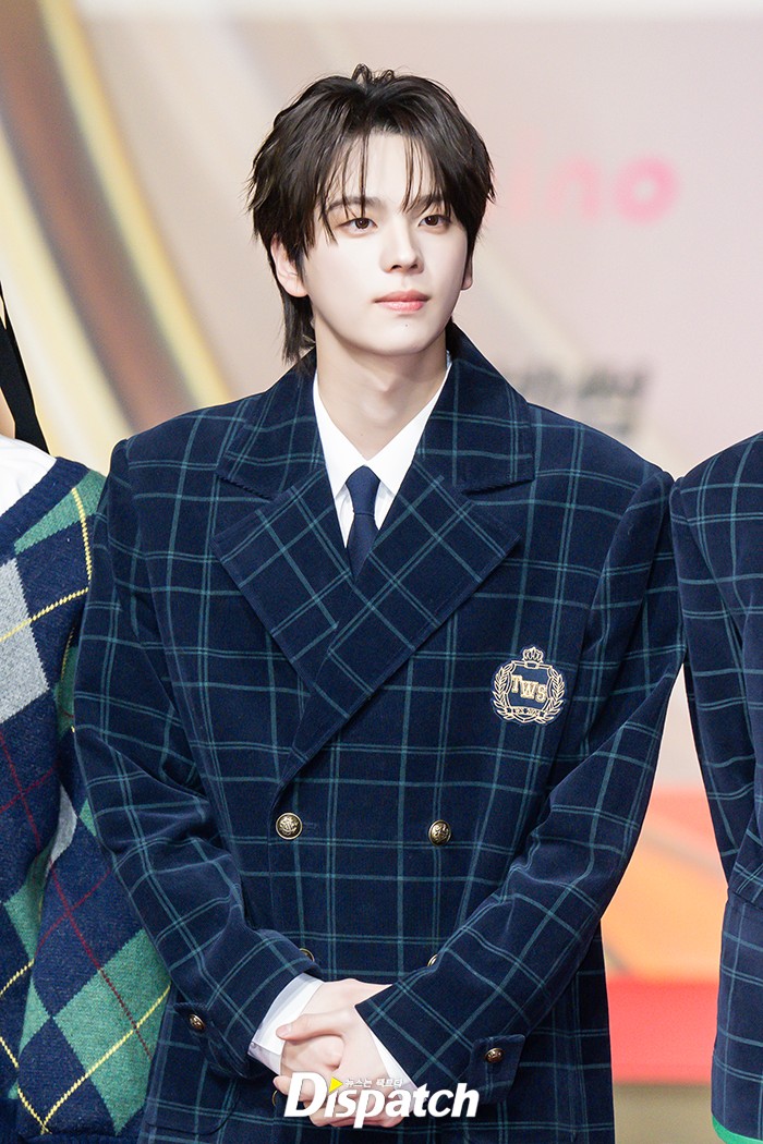 '투어스' 신유는 체크 코트로 멋을 냈다. 잘생긴 비주얼이 돋보였다.