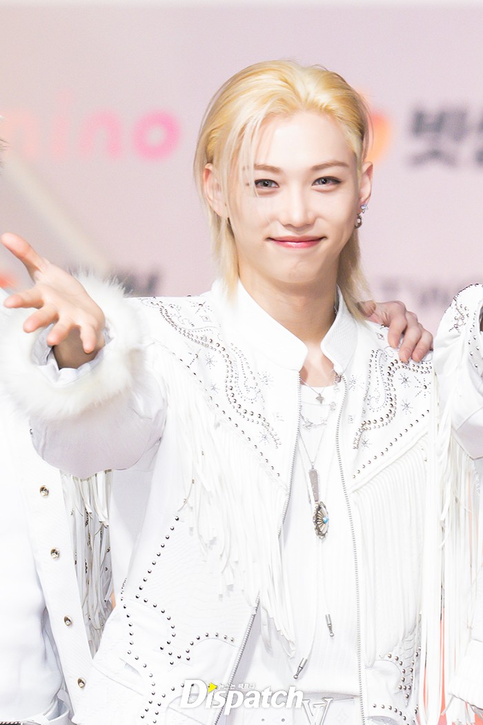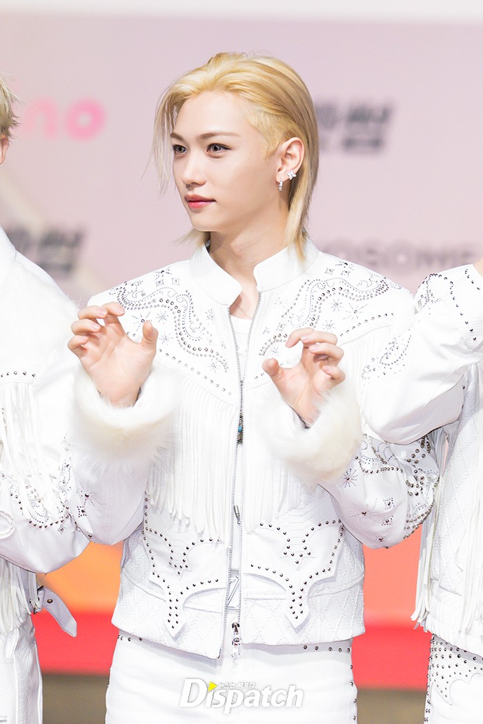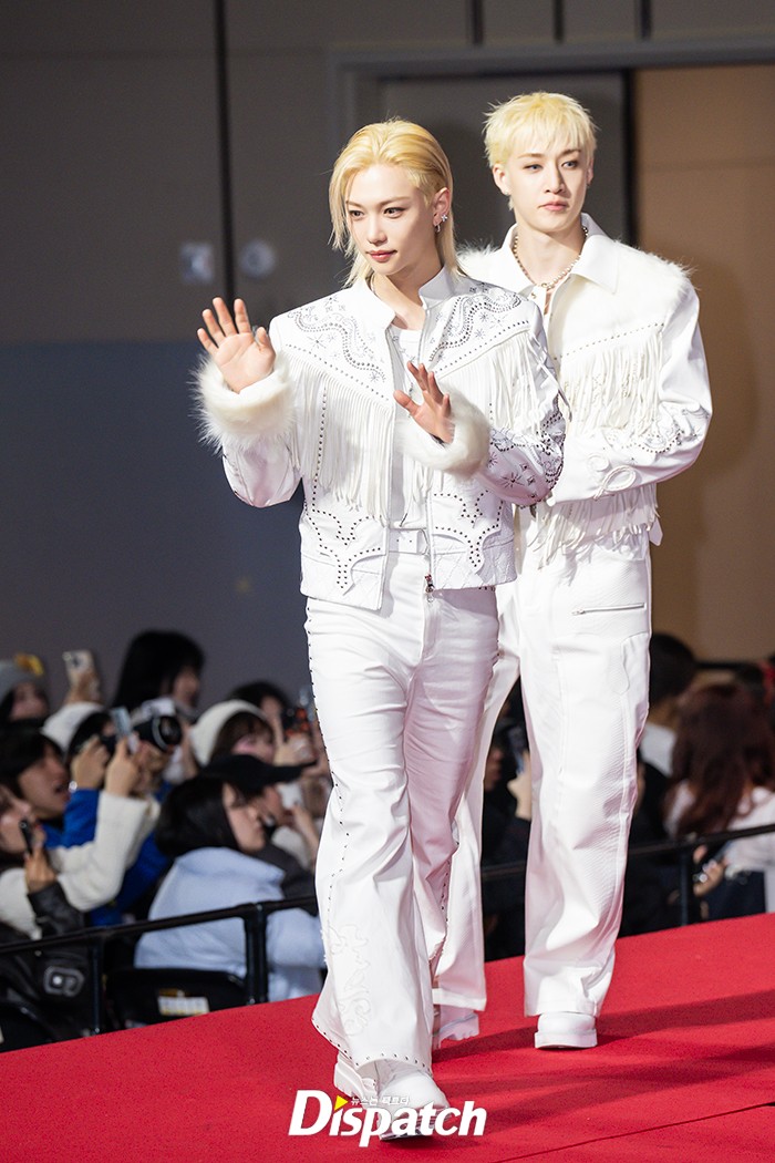 '스트레이 키즈'는 화이트 의상으로 멋을 냈다. 필릭스는 잘생긴 비주얼로 시선을 사로잡았다.