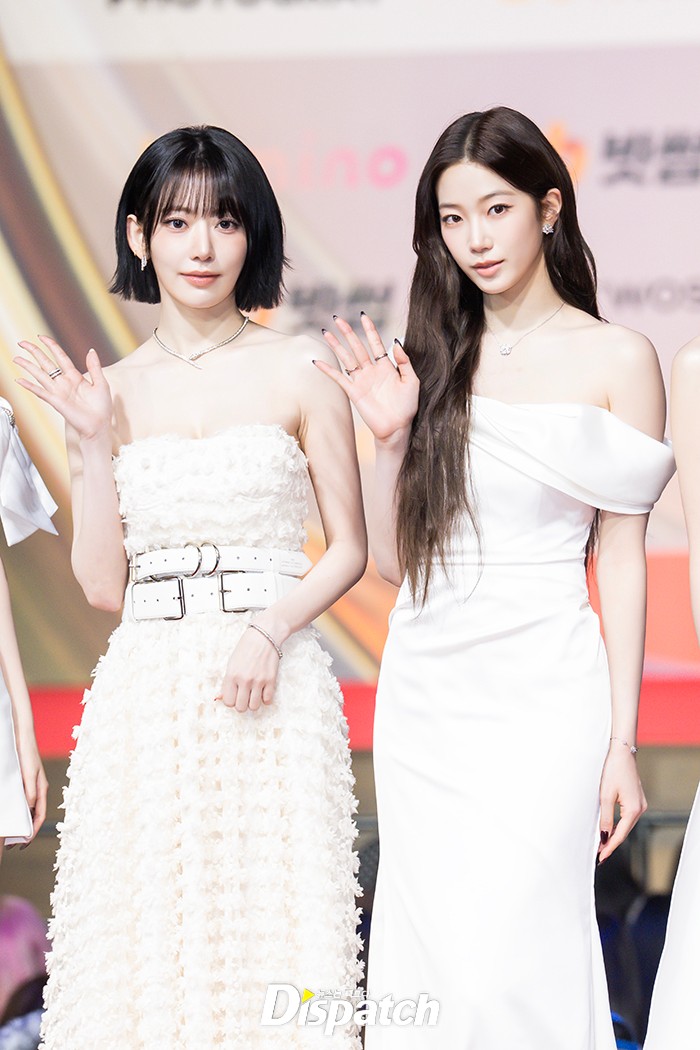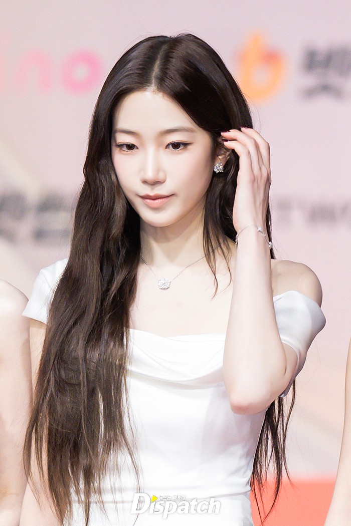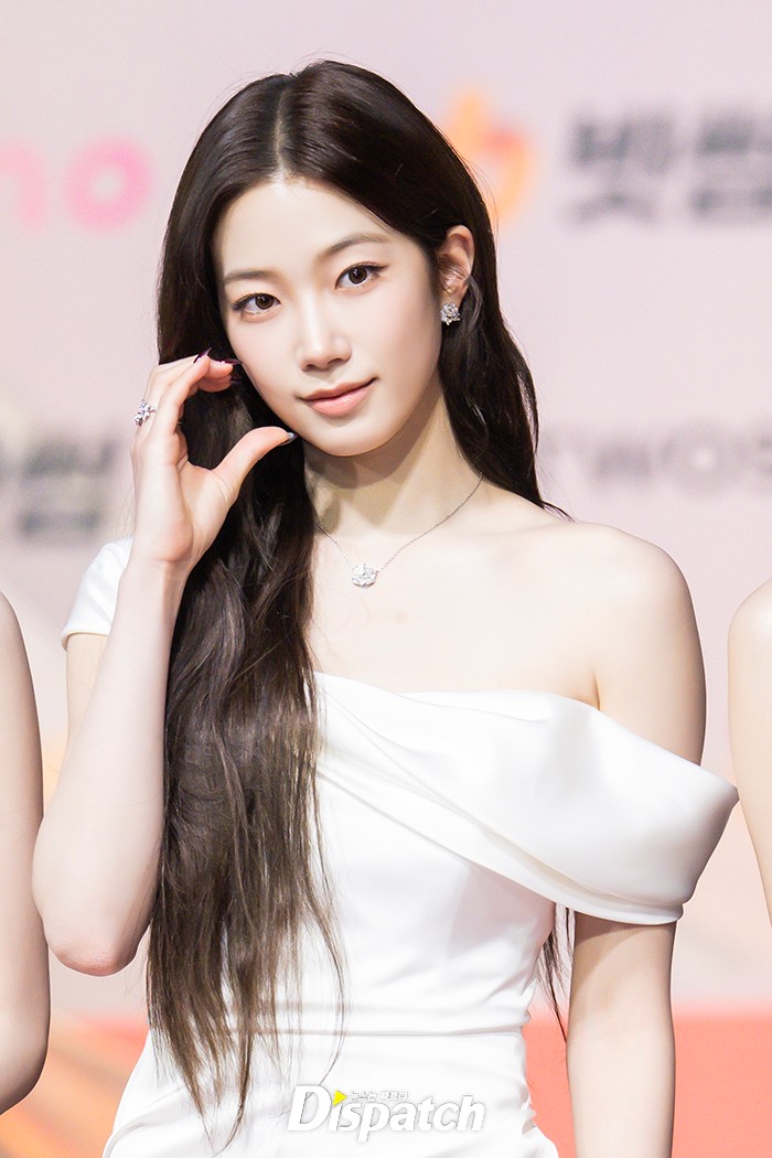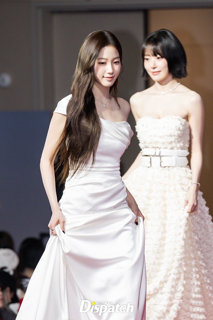 '르세라핌' 카즈하는 화이트 튜브톱 드레스로 아름다운 자태를 뽐냈다. 인형같은 비주얼로 시선을 사로잡았다.